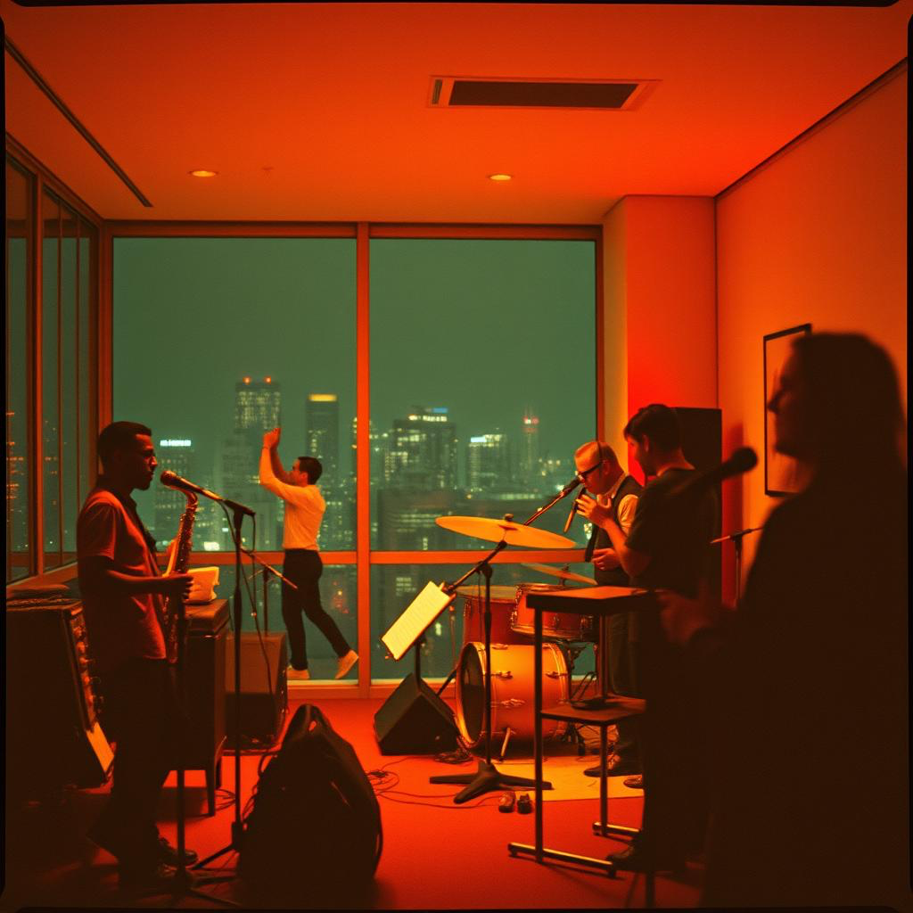 Instrumental jazz-funk with a jazz-rock guitar lead—edge-of-breakup tone, lyrical bends, tight double-stops, occasional octave pedal for melody pops, Keep the low end organic: fingerstyle electric bass (roundwounds), syncopated but warm; no synth bass, Clavinet lays percussive 16ths and comping stabs; Rhodes adds gluey pads and occasional chord swells, Drums: fatback pocket (snare ghosts, rim knocks, open-hat barks), sprinkled percussion (congas, shaker), Horns (tp/ts/bone): concise riffs, triad punches, and a shout-chorus answer to the guitar hook, Form: guitar riff intro → A hook (clav/guitar unison) → B section with slick chord walkups → breakdown to drums+bass → guitar solo with trading 4s vs horn hits → brief 7/8 interlude → triumphant A recap + tagged outro vamp, Live-in-studio warmth; crowd-close mics, Hooks first, chops tasteful, groove irresistible