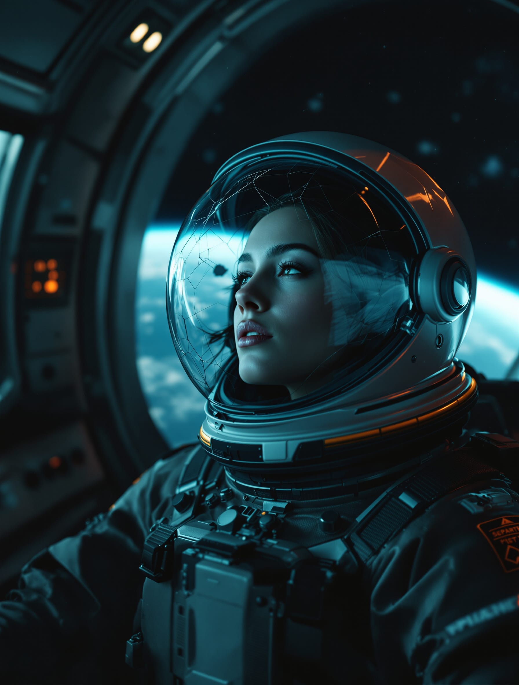 C Major, Cinematic sci-fi art rock with orchestral atmosphere, Slow to mid tempo, spacious and suspended, Begin with distant organ-like pads, soft piano pulses, and low string swells, Clean electric guitars enter gradually with sustained notes and subtle delay, expressive and restrained, Drums start minimal and heartbeat-like, then slowly grow into a powerful but controlled rhythm, Bass is deep and warm, Use modal harmony and non-functional chord movement, Avoid predictable cadences, Sections must evolve in density and emotion, Build through layering, not volume, Female lead vocal is intimate and fragile but strong, floating above the arrangement with unresolved melodic endings, Bridge drops to near silence, then final chorus rises with full orchestral weight, organ, strings, and guitars together, before drifting into an epic, unresolved outro, Production is wide, cinematic, and emotional, with massive space, controlled highs, deep low end, no pop gloss, isolation, distance, hope