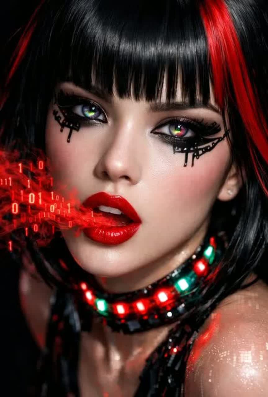 A dark pop, darkwave, and nu-metal hybrid with brooding, tense energy, driven by metallic synths, distorted bass, and jagged arpeggios, Deep, growling sub-bass and syncopated percussion underpin the track, while stuttering hi-hats, industrial clicks, and sharp rhythmic hits create a relentless momentum, Sonic waves ripple through the mix with spatial depth, layered with warped FX, echoing stabs, and shimmering atmospherics, Breathy, sultry vocal chops and bed-spring-like textures add subtle sexual tension, while sliding pads and glitched leads give a futuristic, technical edge, Chaotic digital distortion and metallic resonances inject raw, angsty intensity, blending dark emotion, hypnotic rhythm, and cinematic production for a moody, edgy, club-ready experience