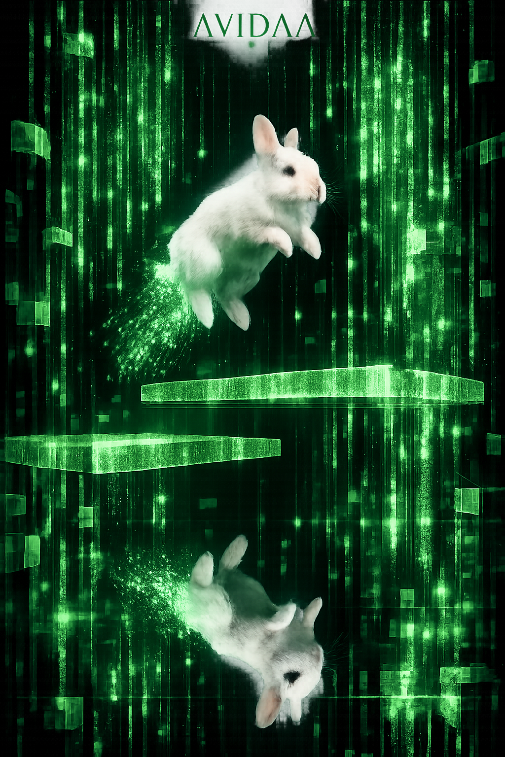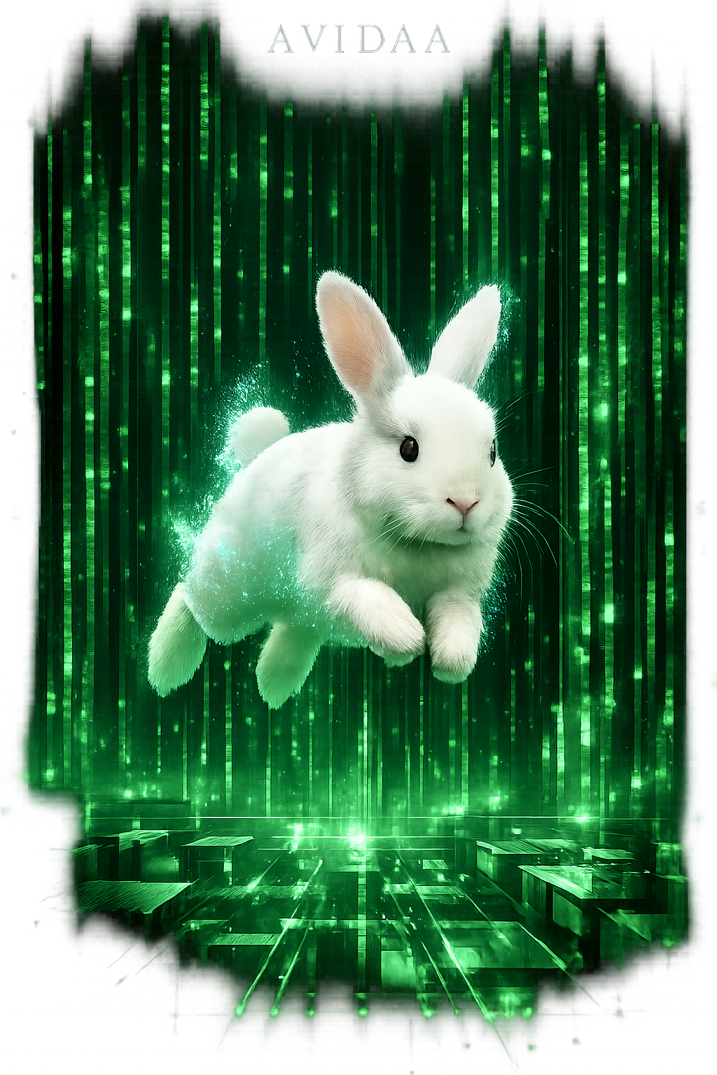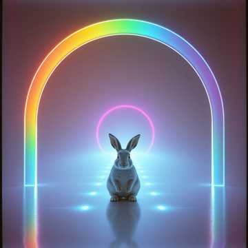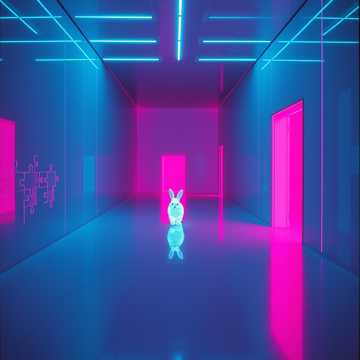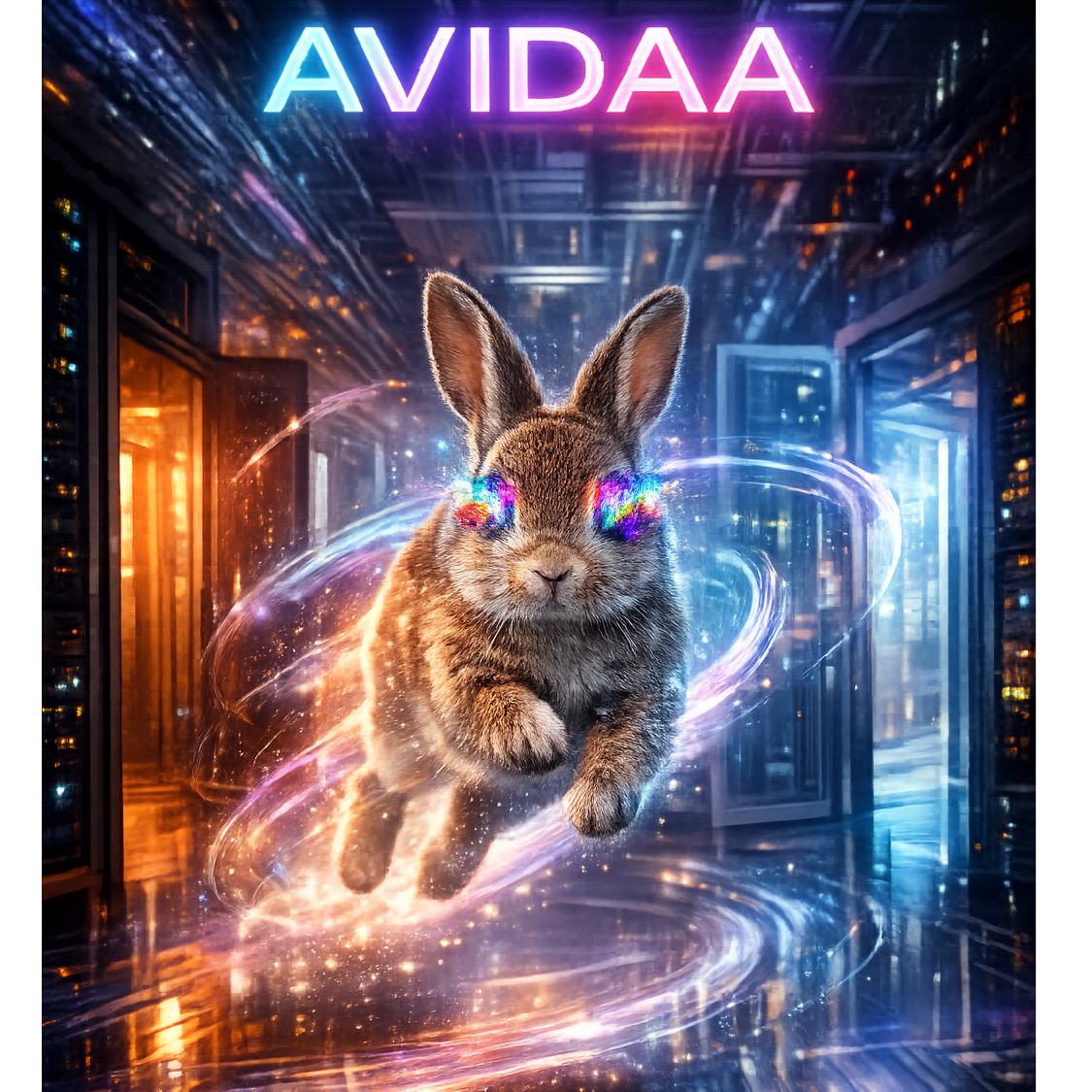 AVIDAA intelligent style, galactic neon deep house / electronic techno fusion, high-energy urban-technical groove, hypnotic, immersive, with **professional mastering**: all volume levels balanced, stereo imaging precise, comfortable loudness, no clipping, no distortion, no noise, ultra-clean mix, smooth sub bass, layered shimmering digital arpeggios, spatial FX simulating AI datacenter energy, Two female vocals, Voice A intimate and tense, Voice B airy and frantic, whispered, offset, dynamically cross-panned, micro-delays, morphing timbres for kinetic sprinting motion, Rainbow neon light trails, hyperrealistic rabbit, doors-through-doors informational world, alpha preserved for compositing, Cinematic, futuristic, high-detail, publication-safe, audio master pro quality, AVIDAA