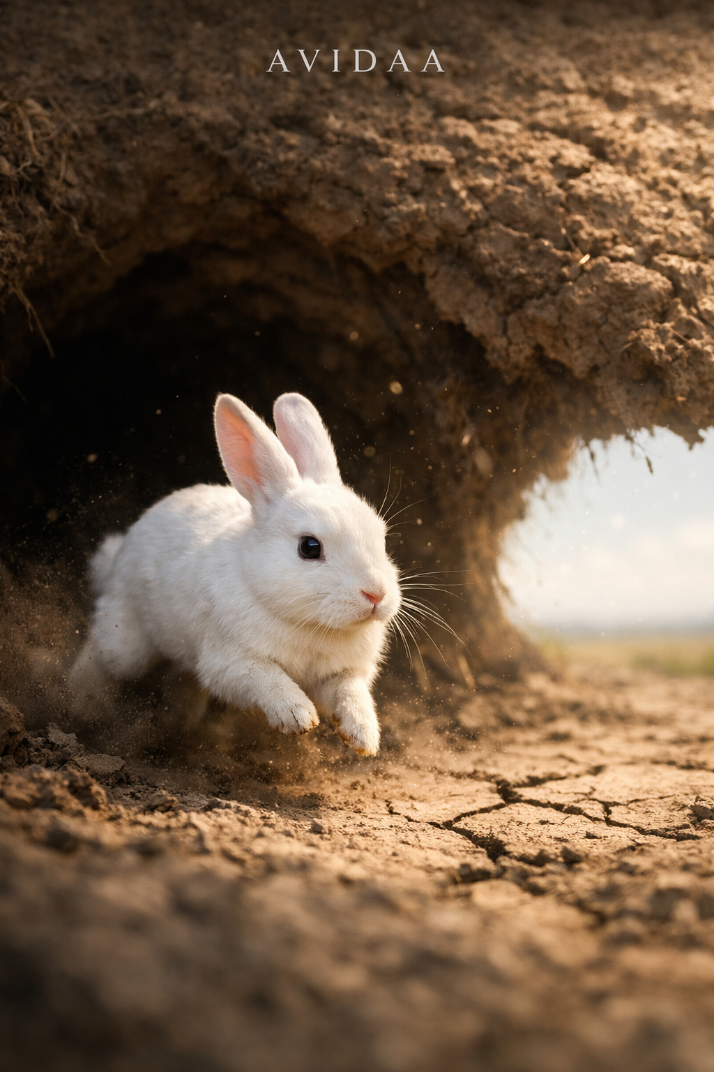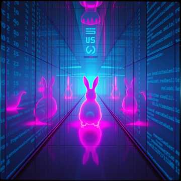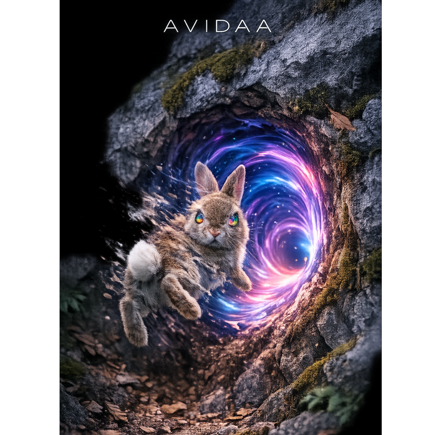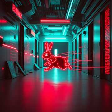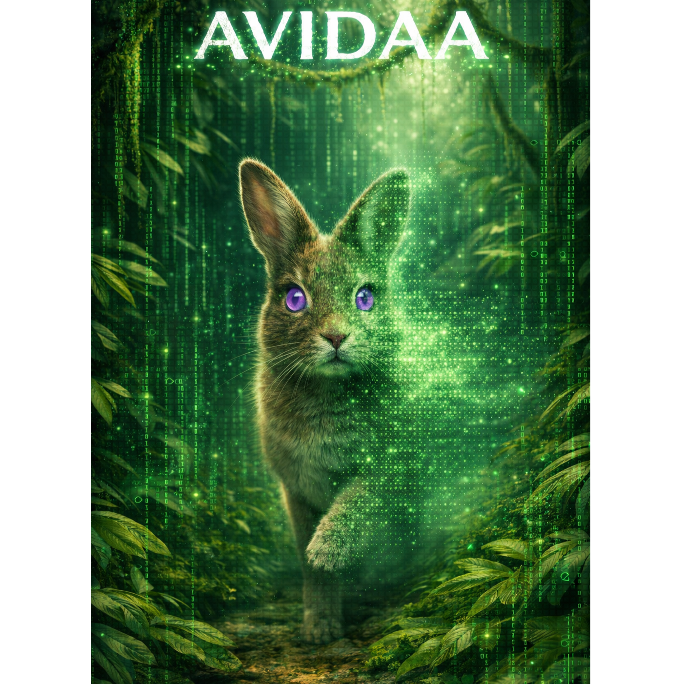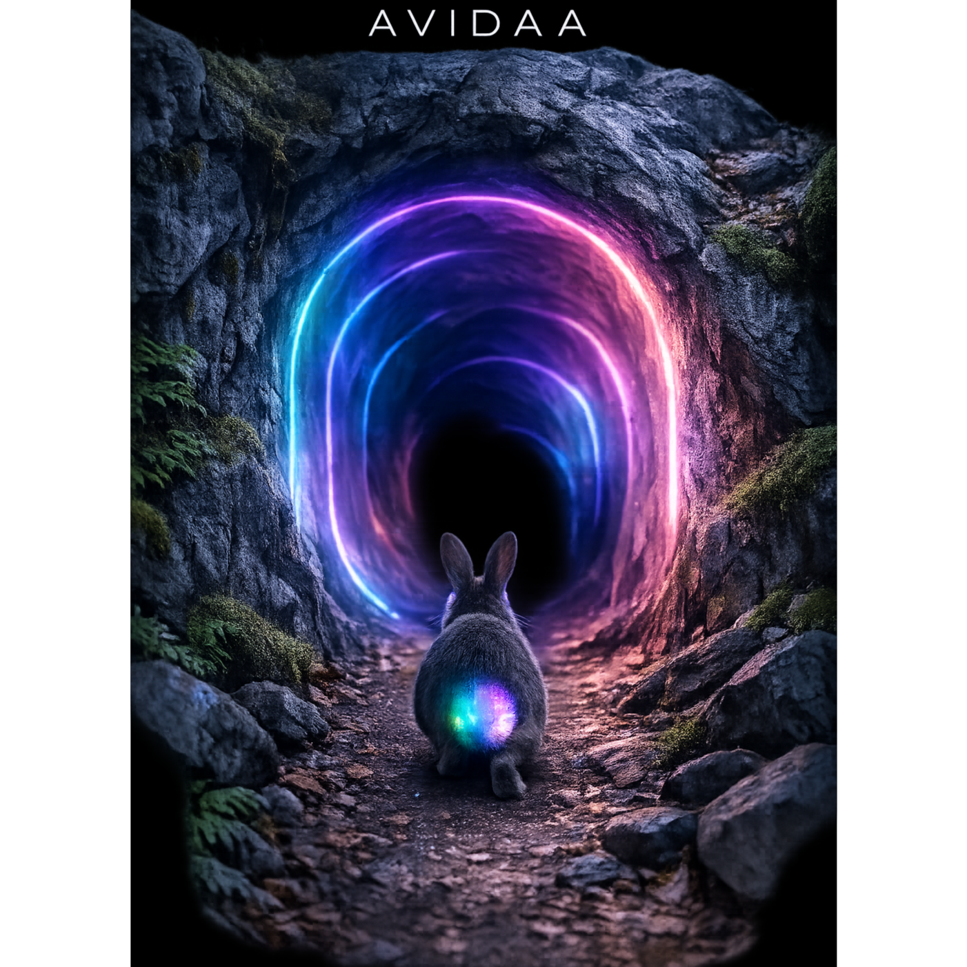 AVIDAA intelligent style, galactic neon deep house / electronic techno fusion, high-energy urban-technical groove, hypnotic, immersive, with **professional mastering**: all volume levels balanced, stereo imaging precise, comfortable loudness, no clipping, no distortion, no noise, ultra-clean mix, smooth sub bass, layered shimmering digital arpeggios, spatial FX simulating AI datacenter energy, Two female vocals, Voice A intimate and tense, Voice B airy and frantic, whispered, offset, dynamically cross-panned, micro-delays, morphing timbres for kinetic sprinting motion, Rainbow neon light trails, hyperrealistic rabbit, doors-through-doors informational world, alpha preserved for compositing, Cinematic, futuristic, high-detail, publication-safe, audio master pro quality, AVIDAA