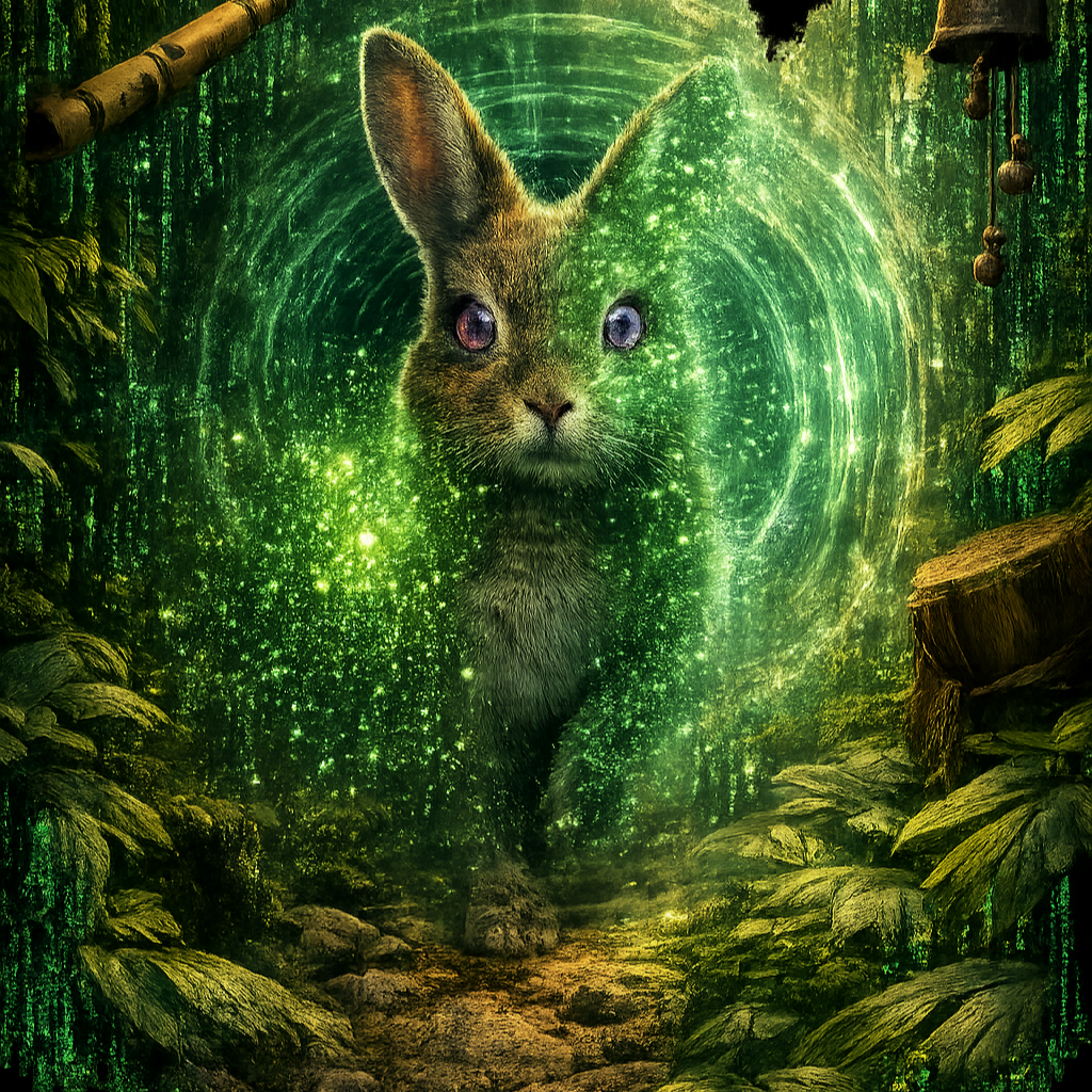 Galactic ambient / melodic deep house fusion, calm yet heroic, fully mastered: volume balanced, stereo clarity, comfortable listening, no noise or distortion, Warm pads, shimmering arpeggios, gentle pulses simulating gates, quantum streams, and protective energy, Two female vocals: Voice A soft and determined, Voice B airy and devoted, whispered, offset, harmonically layered, Hyperrealistic rabbit, flowing motion, interaction with companions, alpha preserved for layering, Cinematic, mystical, immersive, publication-safe, pro audio quality, AVIDAA