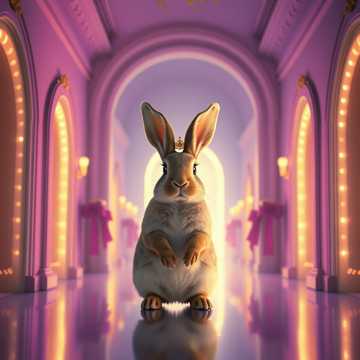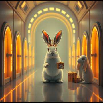 Galactic deep house / melodic ambient fusion, calm yet regal, fully mastered: volume balanced, comfortable loudness, stereo clarity, no noise, no distortion, Subtle warm pads, shimmering arpeggios, light percussive pulses simulating movement through gates and corridors, Two female vocals: Voice A soft and caring, Voice B airy and devoted, whispered, offset, harmonically layered, Hyperrealistic rabbit, flowing kinetic motion, interaction with multiple companions, alpha preserved for layering, Cinematic, mystical, immersive, publication-safe, pro audio quality, AVIDAA
