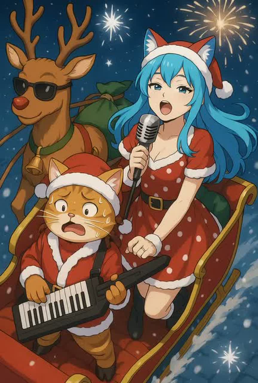 drumfunk, The world's most energetic and intoxicating futuristic and glitchy 2030s disco-pop, Christmas Love Song, disco influence, 2030s disco, pop, upbeat, Glitchy rhythm, The world's most high-spirited female trio vocalist, female lead vocals, and emotional harmonies, Lead vocalist with the world's most husky voice, The most passionate chorus in the world with high tension, orchestral arrangements, Sleigh bells (main accents), Electric guitar (clean tone with light overdrive), piano-driven, string sections, four-on-the-floor beat, Glockenspiel (Christmas sparkle), euphoric, danceable, vintage production, lush orchestration, prominent grand piano with intro glissando, bubbly synth lead, Synth-heavy, lush strings, funky synth bass, four-on-the-floor drums, danceable rhythm, retro synths, and a bittersweet yet joyful melody, catchy piano melody, string arrangements, uplifting chorus, vintage synthesizers, polished production, Joyful, celebratory, danceable, uplifting, around 170 BPM, ‑male vocals, ‑harsh transients, ‑distorted saturation, ‑excessive brightness, ‑overlapping piano/guitar, ‑sub-bass overload, ‑phase smear, ‑overcompression, ‑multi-layered orchestration, ‑long reverb tails