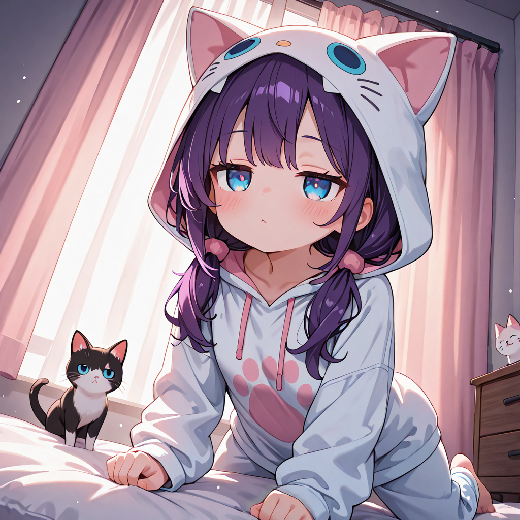 EDM, A cute and clearly kawaii downer female voice, though a little lazy, technical sound, Japanese, Very cute electro swing dreaming pop, Cute cat sleeping, Expressing the cuteness, cute environmental sounds, Create a slightly ambient atmosphere, j-pop techno, lovely cat