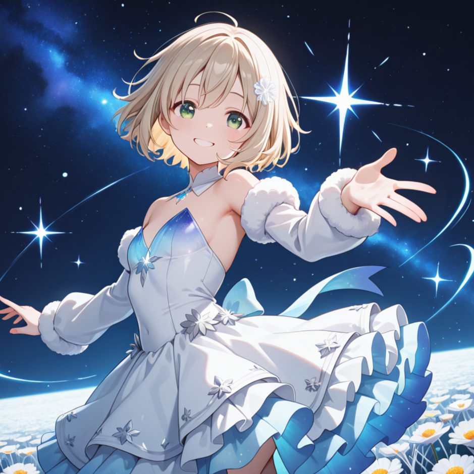 A combination of beautiful neuro-hop and ambient sounds reminiscent of a starry sky, A kind and beautiful cute female voice, A beautifully chorus, Japanese, Floating feeling filling, Beautiful piano sound, Warm Strings and Dreaming Synth sound, starry effects