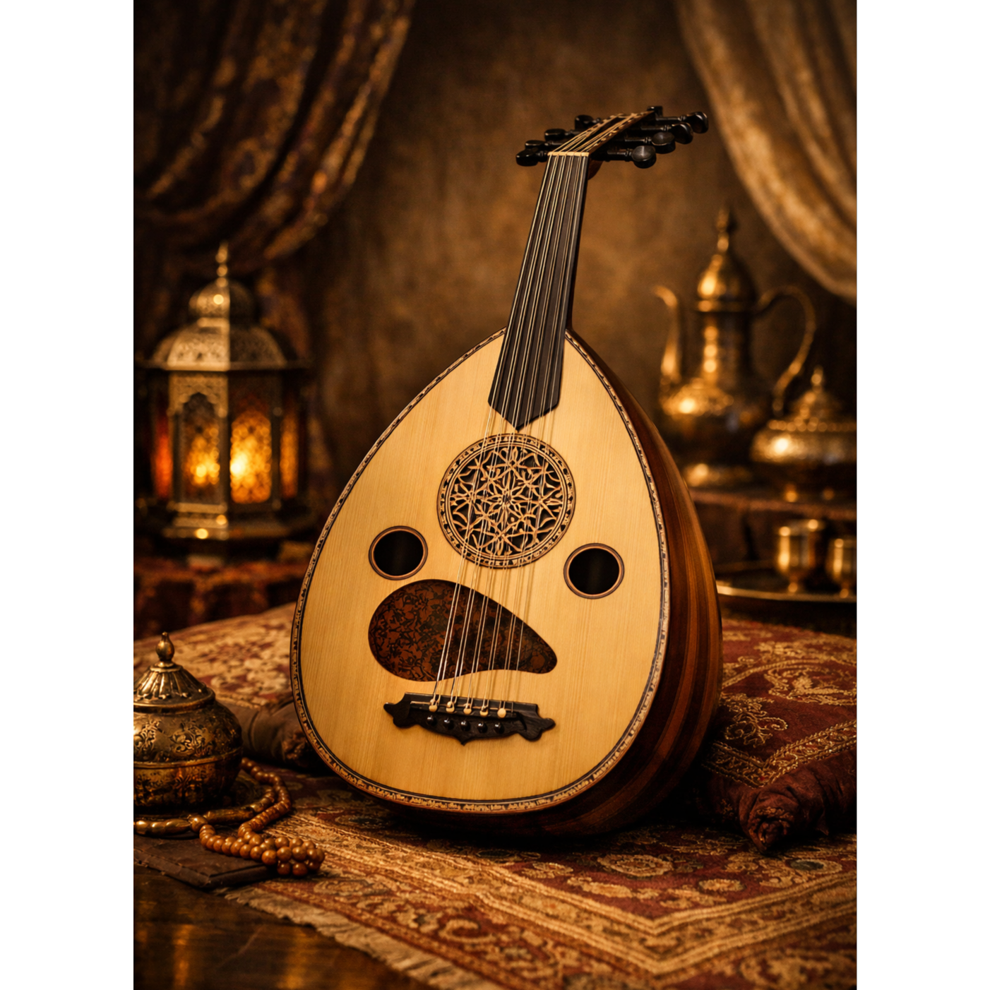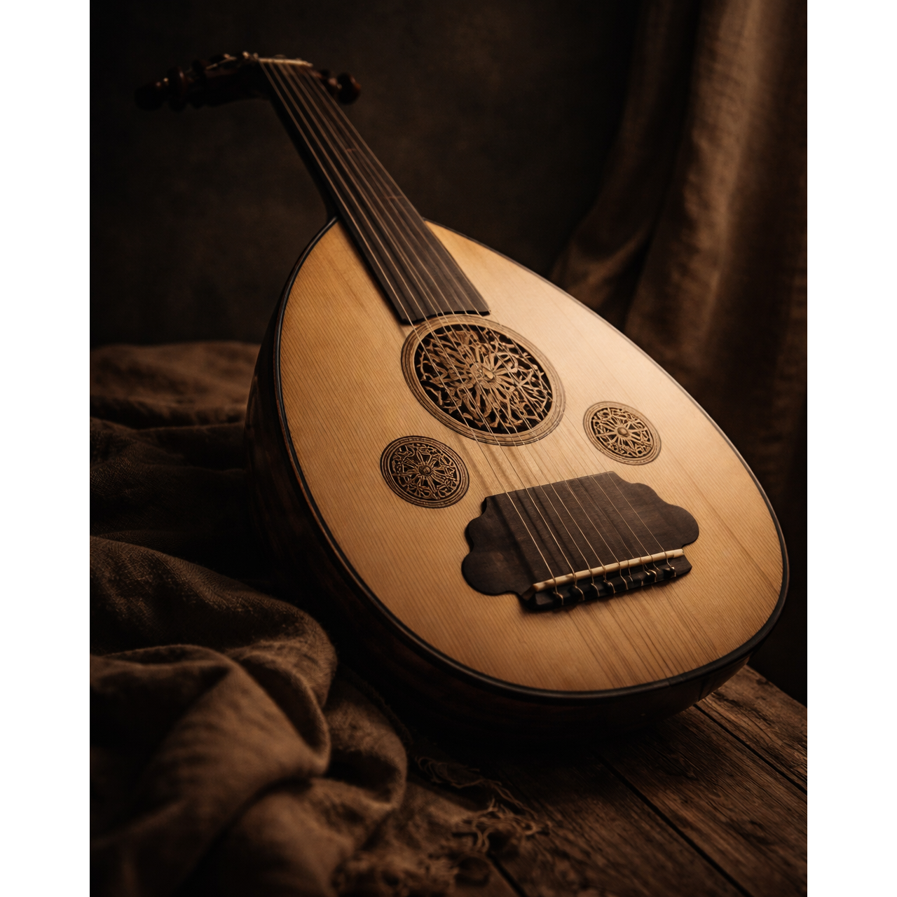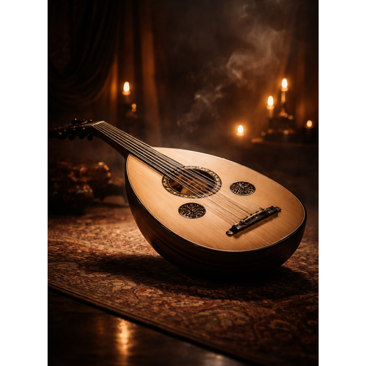 A lone oud weaves expressive, meditative lines in a slow 60 BPM tempo, exploring a rich minor maqam, Nuanced slides and ornamentation evoke deep emotion, Subtle echo enhances intimacy, with no percussion or vocals, The studio-quality mix captures every resonant detail, inviting spiritual reflection