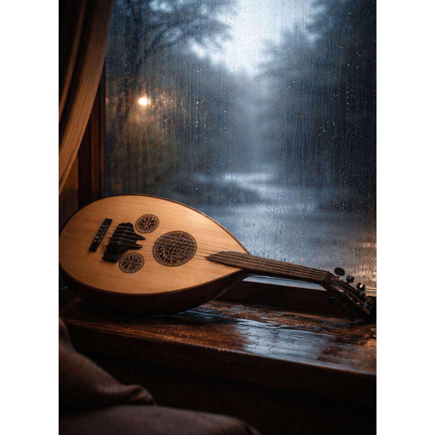 A solo oud carries a gentle, melancholic melody with intricate, expressive phrasing, Subtle light rain ambience forms a natural backdrop, At 70 BPM, the pace is unhurried, Lush, spacious reverb envelops each note, while a cinematic mix heightens emotional depth and spacious reflection