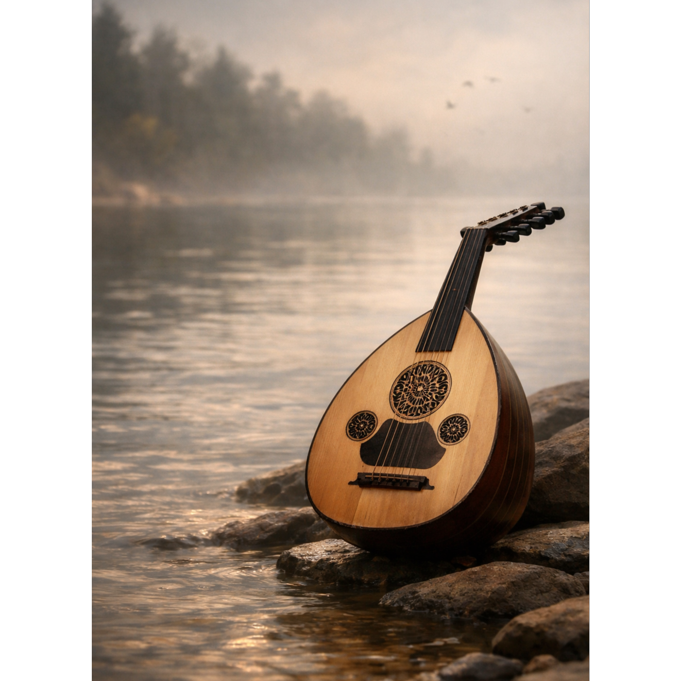 A solo oud piece unfolds in delicately flowing 72 BPM phrases, its expressive melodies gliding above subtle water ambience and faint birdsong, Gentle, organic room reverb envelops each note, merging into an ambient cinematic texture—calm, immersive, and deeply reflective