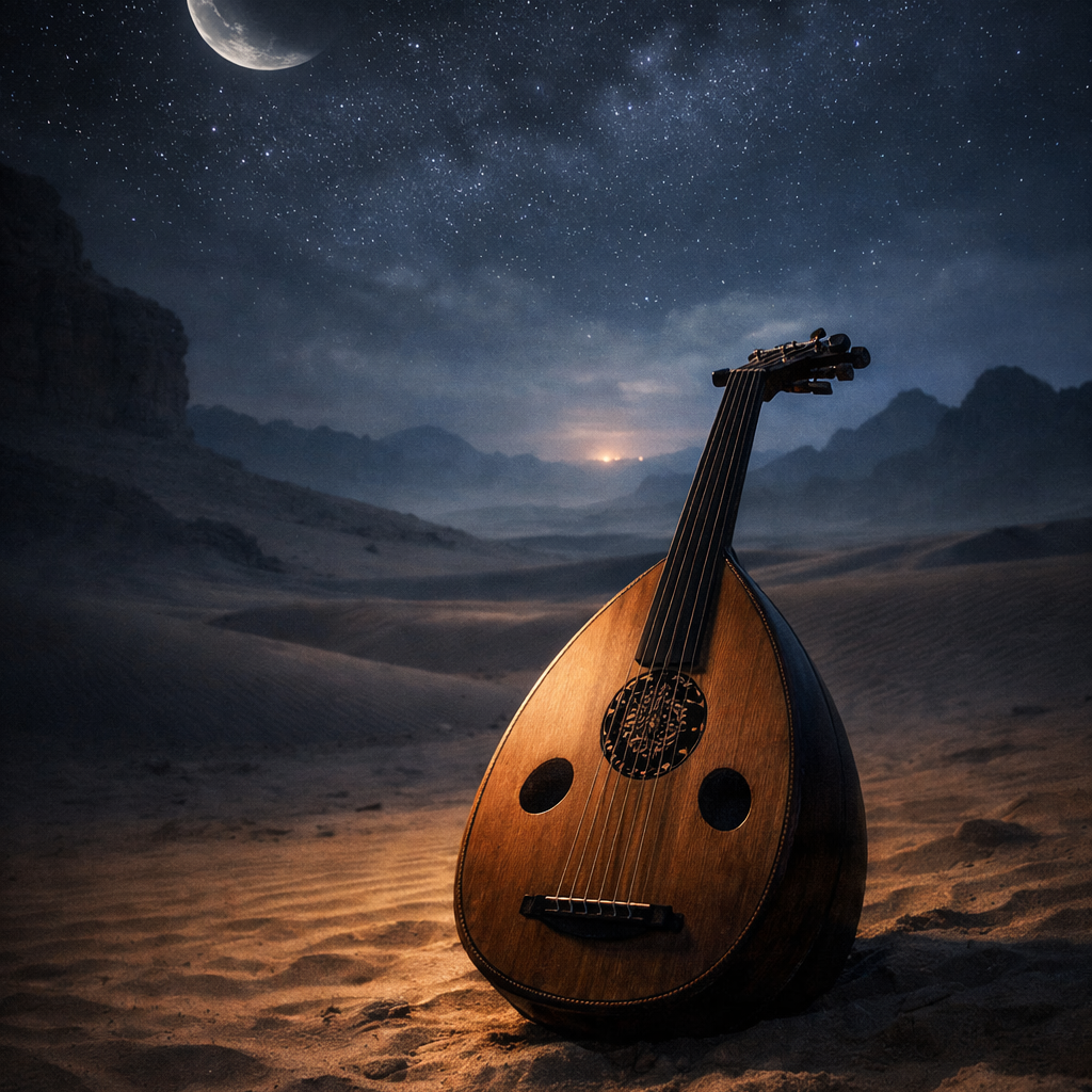 A cinematic solo oud piece with a mysterious, modal melody unfolds at 75 BPM, gradually growing in presence, Sparse fingerpicking opens over desert night ambience; a very low, subtle atmospheric pad adds depth, Layers of reverb create vast, epic yet intimate space, echoing under the starlit mood
