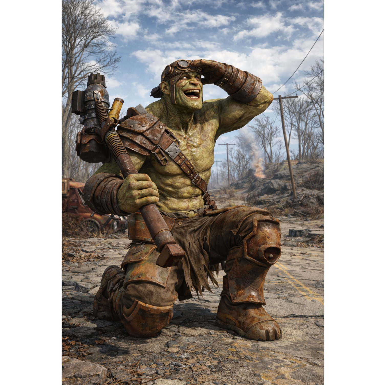 Vocals: deep guttural male voice, super mutant style, broken grammar, joyful tone