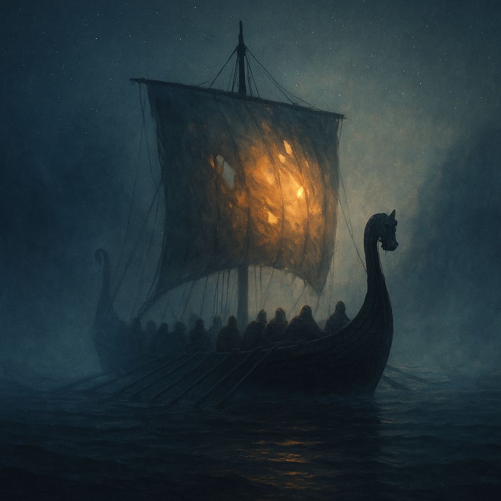 A dark ethereal Norse fusion piece with a liminal “between worlds” sound, 102 BPM, D minor, Opens with fading battle noise dissolving into distant heartbeats, distorted wind, and ghostly harmonic whispers, Female lead begins soft and breathy, drifting like a spirit leaving the body, Male vocals answer in deep ritual tones, not chanting but echoing like voices through fog, Midsection shifts into a post-rock swell: bowed bass, distant thunder rumbles, and shimmering runic chime textures, War drums enter only after the ascension moment, slow and massive, Final chorus erupts with radiant, otherworldly choirs, storm-bass pulses, and airy vocal trails that feel weightless, Ends with a single low horn and dissolving wind, Mood: liminal, celestial, ritualistic, triumphant, hauntingly beautiful, #nordic #valhalla #cinematic #postrock #ritual #ethereal #ambientmetal #ascension #northwind, guitar, experimental, synth, electronic