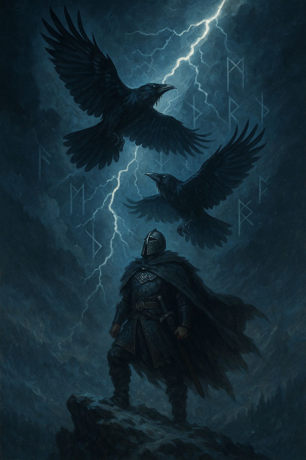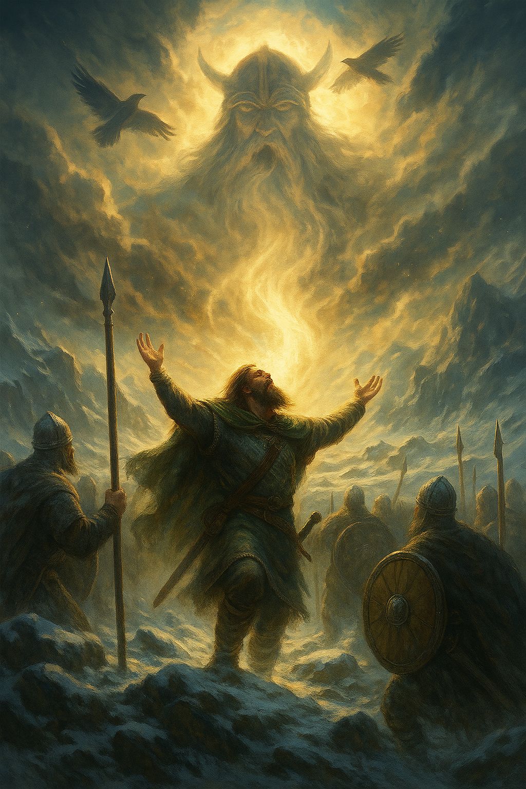 Cinematic Nordic folk-metal anthem infused with Norse mythic undertones, 102 BPM, D minor, Opens with the sound of wind and cawing ravens echoing over distant thunder, Ethereal female lead vocals with deep male chant harmonies create a ritualistic tone, Slow war drums and low horns build like an ancient storm, Midsection introduces cello and nyckelharpa weaving around throat-sung drones, symbolizing divine whispers, Bridge erupts into a choral invocation with layered harmonies and thunder cracks, then resolves into a soft wind and wingbeats, Mood: divine, ominous, awakening, reverent, #vikingfolk #nordic #folkmetal #norse #cinematic #chant #raven #northwind #epic #spiritual