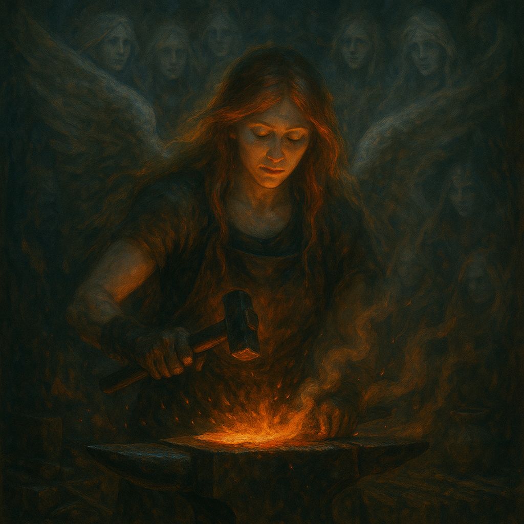 Haunting Nordic folk-metal ballad featuring ethereal female lead vocals with deeper female harmonies for contrast, 98 BPM, D minor, Opens with wind and hammer strikes in a frozen forge, faint fire crackling, Lead female voice enters softly over nyckelharpa and cello drones, singing of endurance, remembrance, and the forging of legacy, Rich, deeper female harmonies rise beneath her in the chorus, adding depth and power, Hand drums pulse like a heartbeat, slow and deliberate, Bridge swells with layered female harmonies and throat-style drone textures for ancestral weight, Final chorus blossoms into a powerful female choir, then fades into the wind and the sound of the forge cooling, Mood: mournful, divine, ancient, powerful, #vikingfolk #folkmetal #femalevocals #nordic #chant #cinematic #northwind #epic #forging #ancestral #ballad