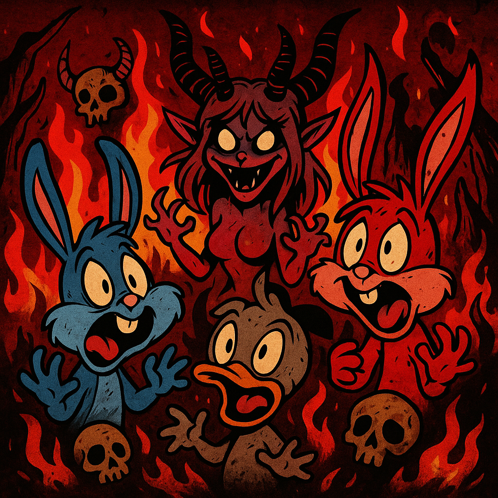 Style: Death Metal × Kawaii Idol × Horrorcore × Cartoon Voices, Voices: mix of cute female idol vocals, brutal demonic female growls, horror whispers, and high-pitched cartoon character voices (like Tiny Toon style, but in Russian), Mood: starts as a happy cartoon intro, then collapses into a nightmarish hellscape, mixing playful absurdity with gore and horror, Instrumentation: heavy distorted guitars, blast beats, breakdowns, J-pop synths, glitch FX, cartoon sound effects (boings, squeaks, laughter), Ending: chaotic breakdown with overlapping cartoon laughter, female growls, and distorted demonic riffs
