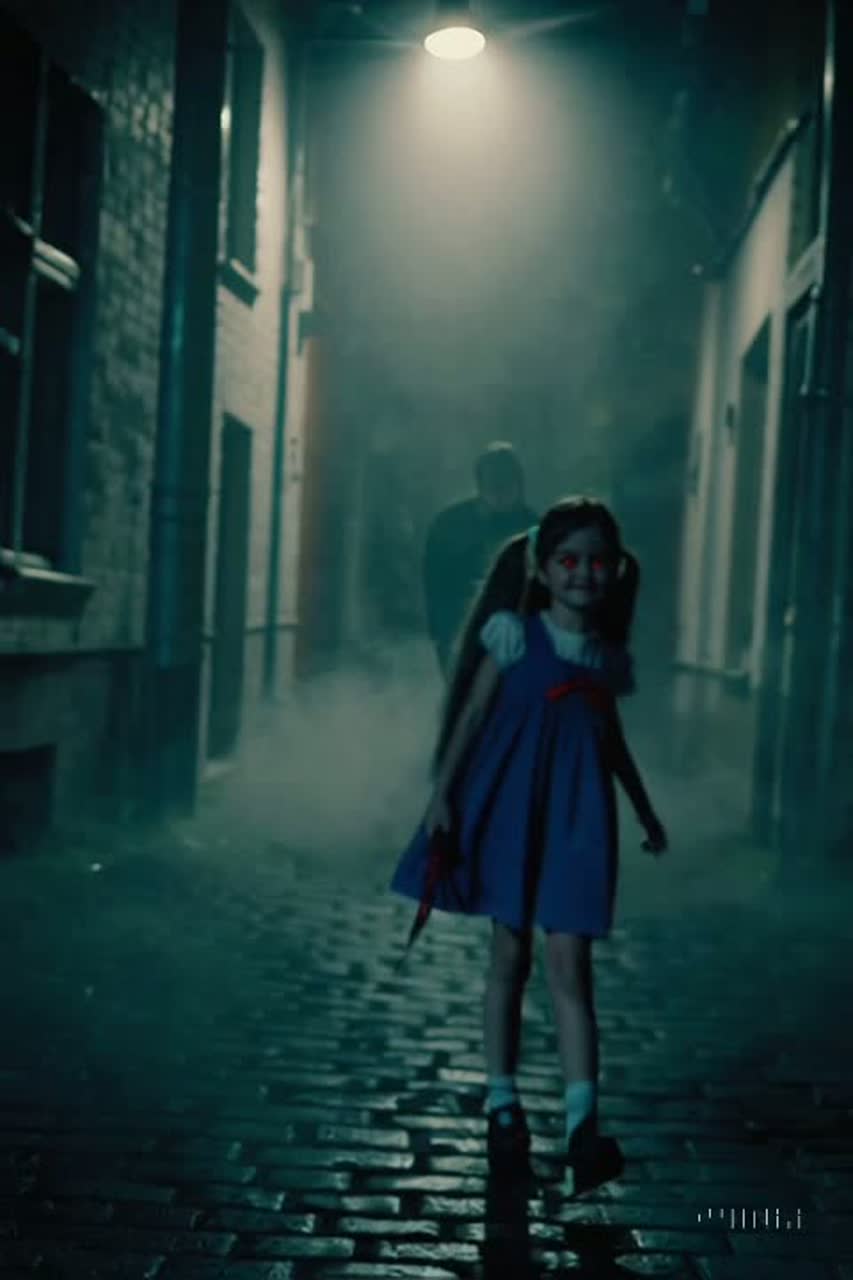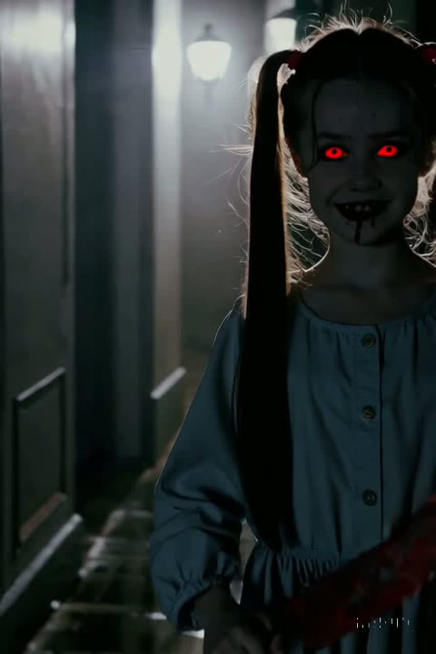 Style: Death Metal × Kawaii Idol × Horrorcore fusion, Voices: mix of cute idol vocals, eerie horror whispers, and brutal guttural growls, Mood: starts innocent and sweet, turns tense, then flips into a terrifying and bloody chaos, Instrumentation: down-tuned guitars, blast beats, heavy breakdowns, layered with playful J-pop synths, horror sound effects (footsteps, whispers, knife sounds), Ending: chaotic instrumental breakdown with demonic riffs, glitchy synths, and overlapping kawaii screams