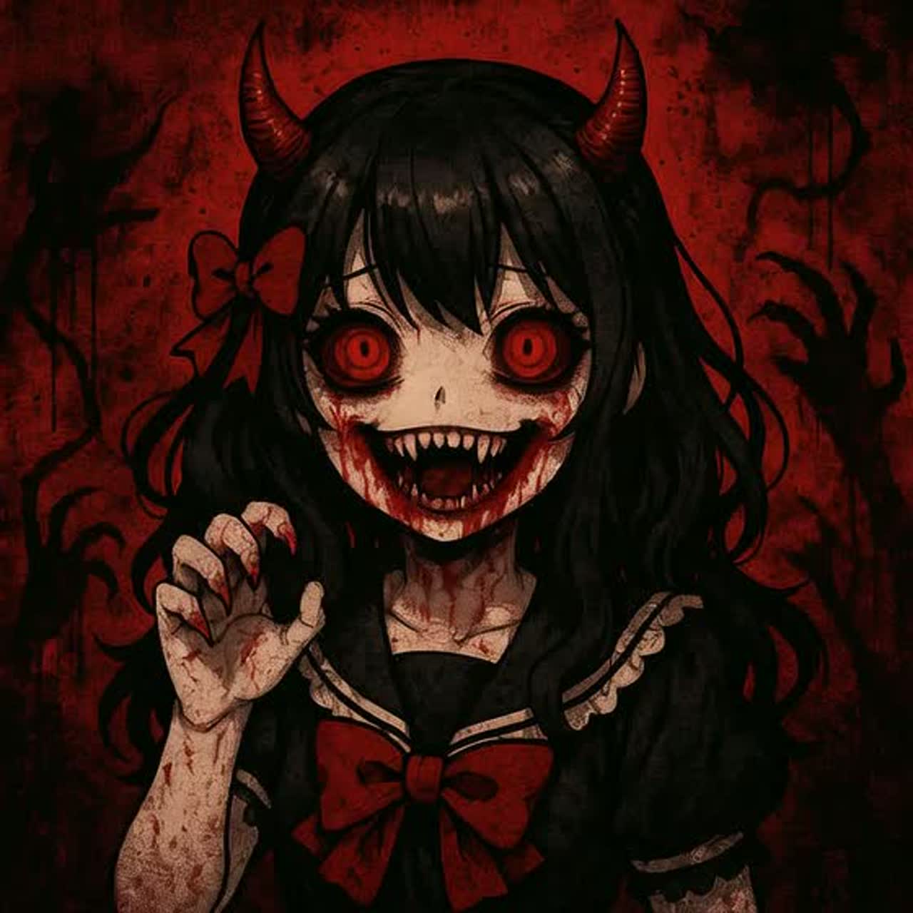 Style: Horrorcore × Death Metal × Kawaii Idol fusion, Voices: brutal guttural growls, cute idol vocals, eerie horror whispers, distorted rap-like horrorcore flows, Mood: chaotic, creepy, playful yet terrifying, Instrumentation: down-tuned guitars, blast beats, horrorcore 808s, distorted synths, creepy piano, glitch FX, screams, Ending: chaotic instrumental breakdown (death metal riffs + horror samples + kawaii synth bells)