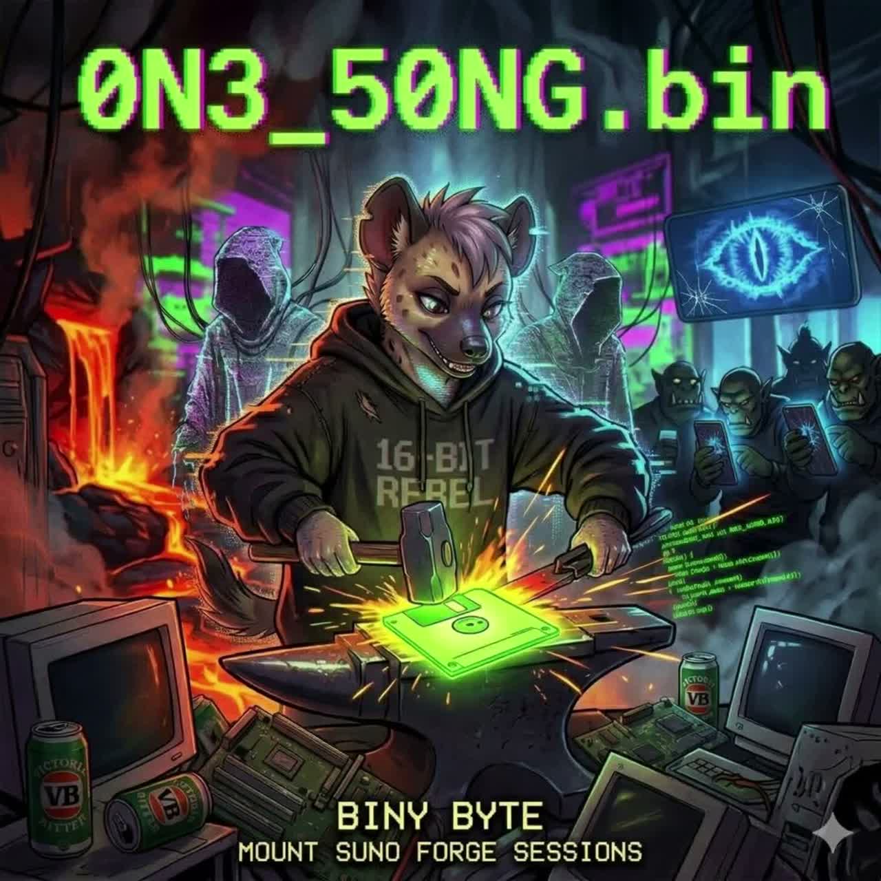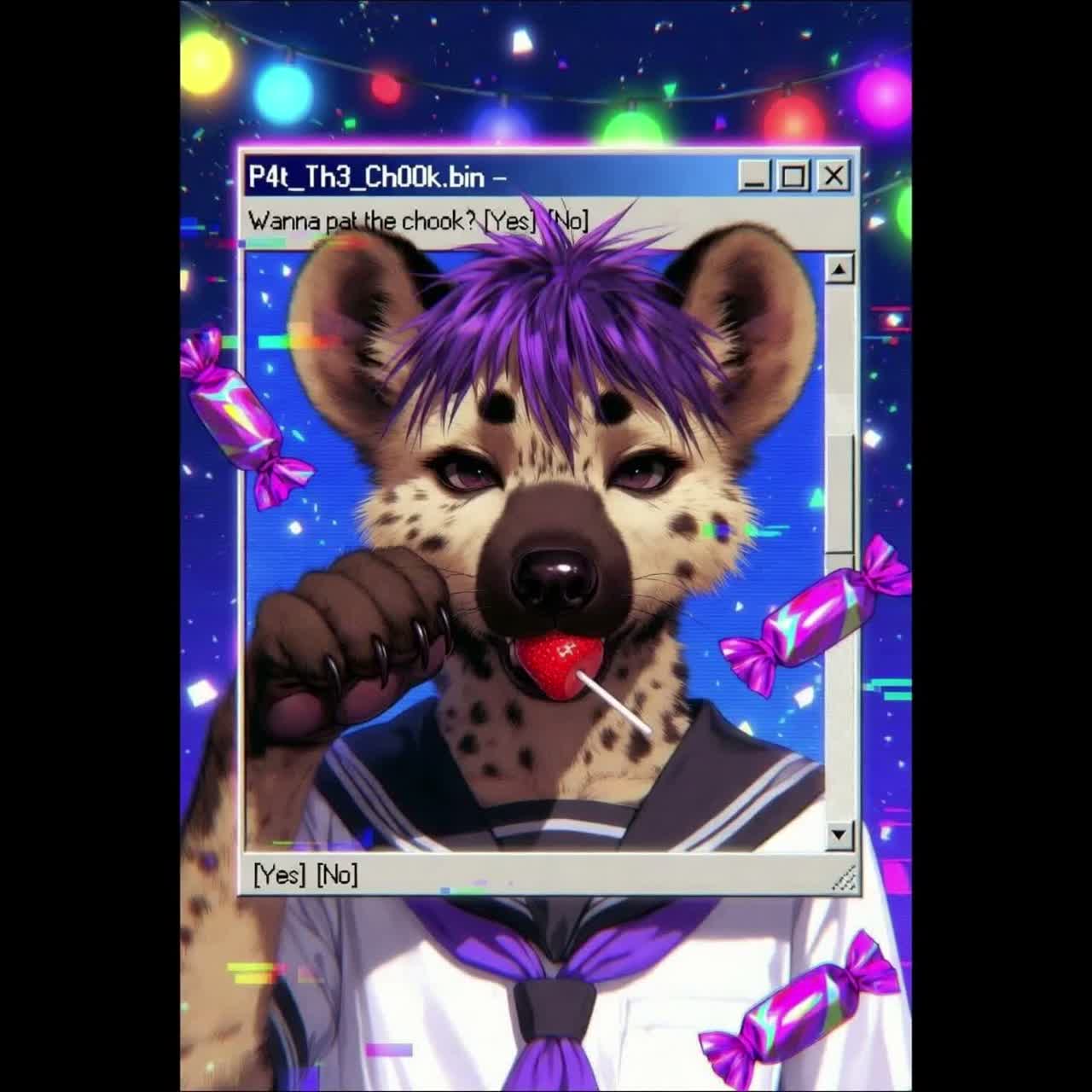 Genre: Kawaii Future Bass, J-Pop, Aussie Indie-Pop wannabe Shibuya-kei, Bubblegum Pop, Instrumentation: Sparkling FM Synths, Toy-Piano, Toy-Percussion, Harsh Digital Glitches, Heavy Side-chain Compression, Distorted 808 Bass, Plucky Percussion, Found Sounds (Camera Shutter, VHS Tape Eject), Glockenspiel, Xylophone, Vocal Style: Aussie schoolgirl twang, characterized by a distinctive slightly husky, raspy timbre reminiscent of a hyena's unique vocalizations, making her instantly recognizable and endearing, cheeky playful rap-talk, breathful whisper, kawaii ad-libs, sudden gritty vocal distortion and hyena giggles, Vocal Consistency: Aussie-accented female vocals, Australian slang pronunciation, playful hyena giggles, staccato "Nye-he-he" ad-libs, Atmosphere: Hyper-bright, Saturated, Candy-coated Nihilism, AV Club Basement, Glitchy Aesthetics, Style: High-energy, danceable and energetic, syncopation with "toy-box" synths, nursery rhyme aesthetic, ā(Bad Songs), āTuneless, āJarring, āCacophony, āOff-key, āRepetitive, āDull, āMundane, āCringe-worthy, āThumping