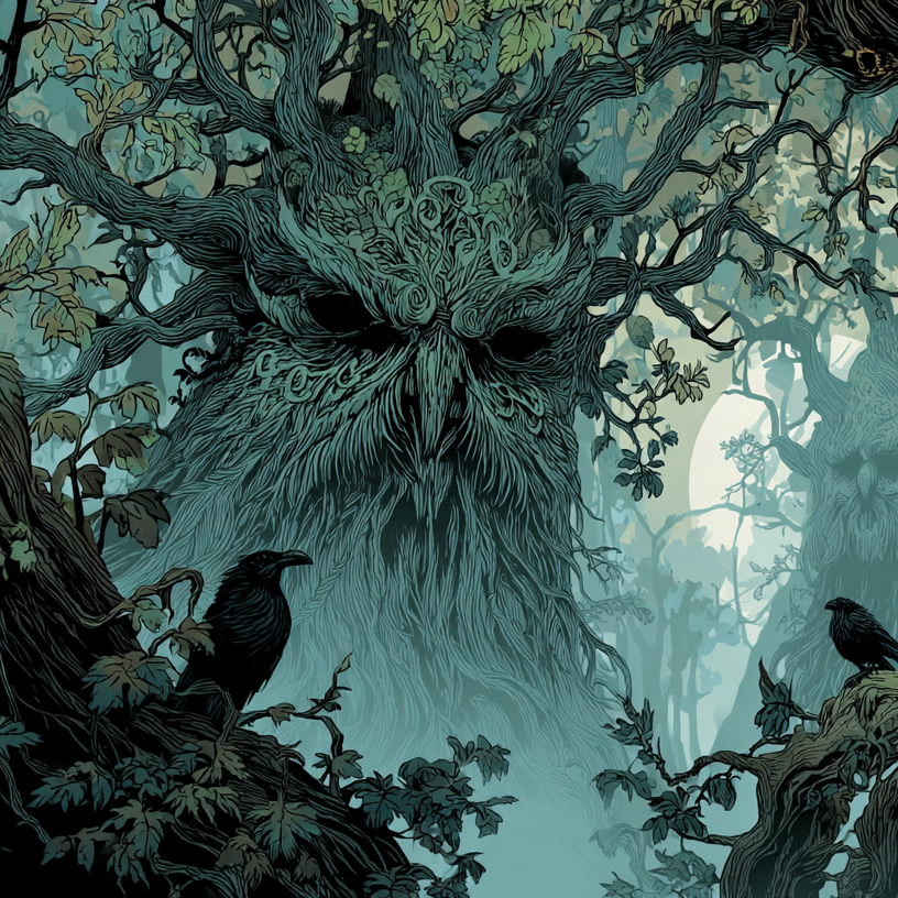 10–15 min rhythmic “ancient forest / ents” ritual ambient with a pulse from the first second (≈100 BPM), Hand drums + stomps + shakers over sub-drones, wood-creak textures, hollow log hits, twig snaps, canopy wind, Deep heavy male humming chant close-mic, huge reverb, hypnotic repetition and gradual layering