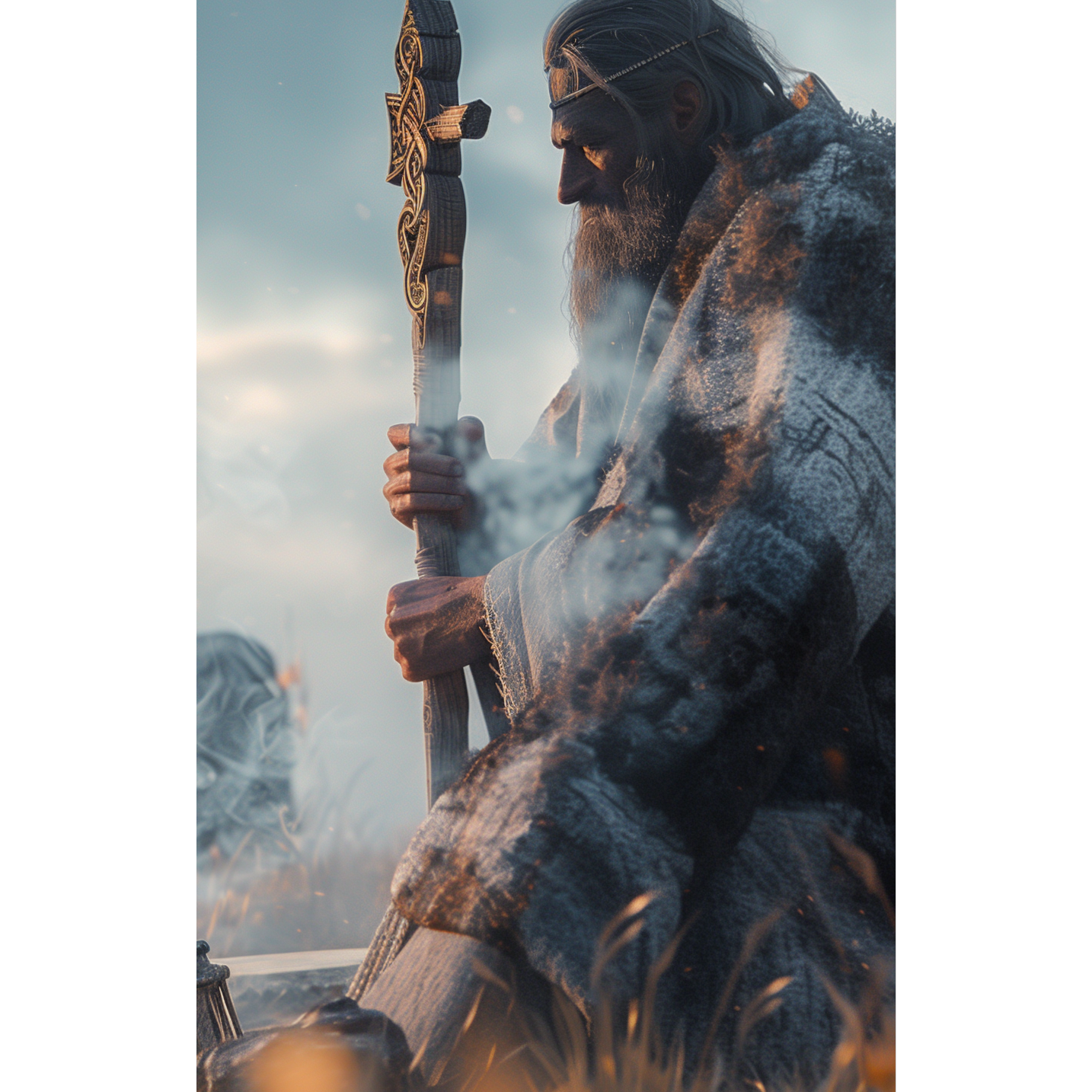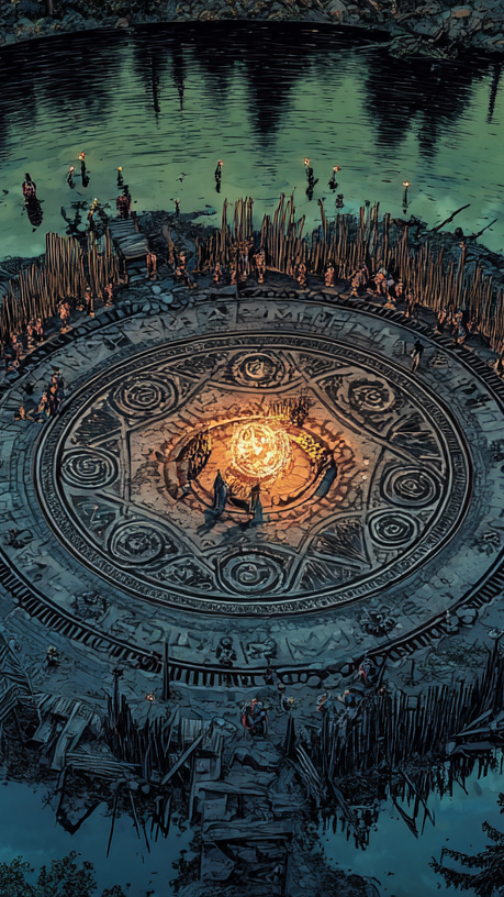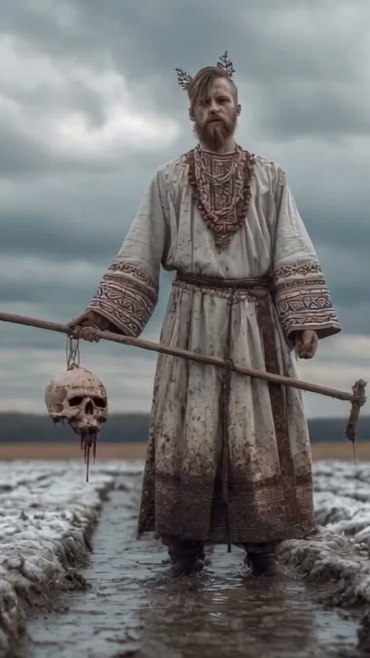 Slavic Dark Ambient, Heavy Ritualistic Percussion, Distorted Low-End Guitar Riffs, Rhythmic Tribal Chanting, Aggressive Spoken Word, Throat Singing, Shamanic Industrial, Dark Folk, No Singing, Gritty, Primal, 90 BPM