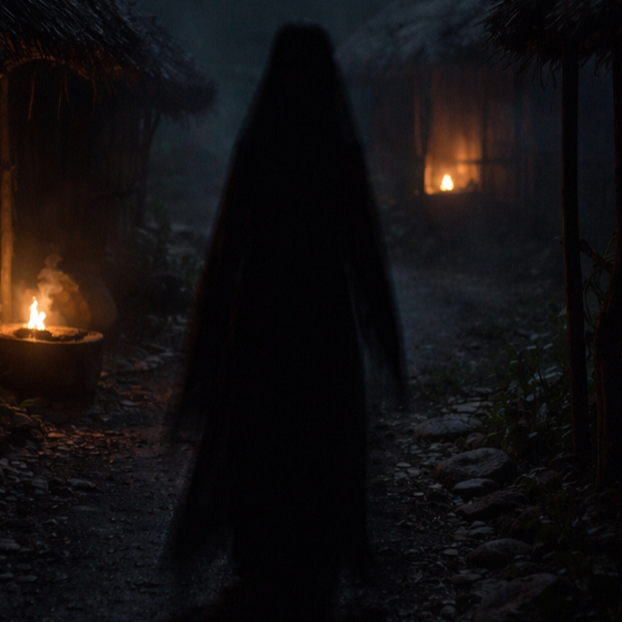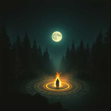 A dark ritual ambient piece inspired by Slavic pagan atmosphere, lasting around 3, 5 minutes, Low droning textures and minor tonal clusters form a static, oppressive base, A distant, wordless female wail drifts in and out like the Nocnica’s presence—breathy lament, thin moans, and ghostly sighs, processed with cold reverb and subtle pitch drift (no lyrics, no clear singing), Sparse non-folk textures replace any flute: bowed metal drones, low throat-like air, and brittle wood resonance (no flutes, no whistles, no pipes), Subtle ritual percussion and forest field recordings—wind, wood creaks—create a cold, archaic, and ominous mood with slow evolution and no melodic release