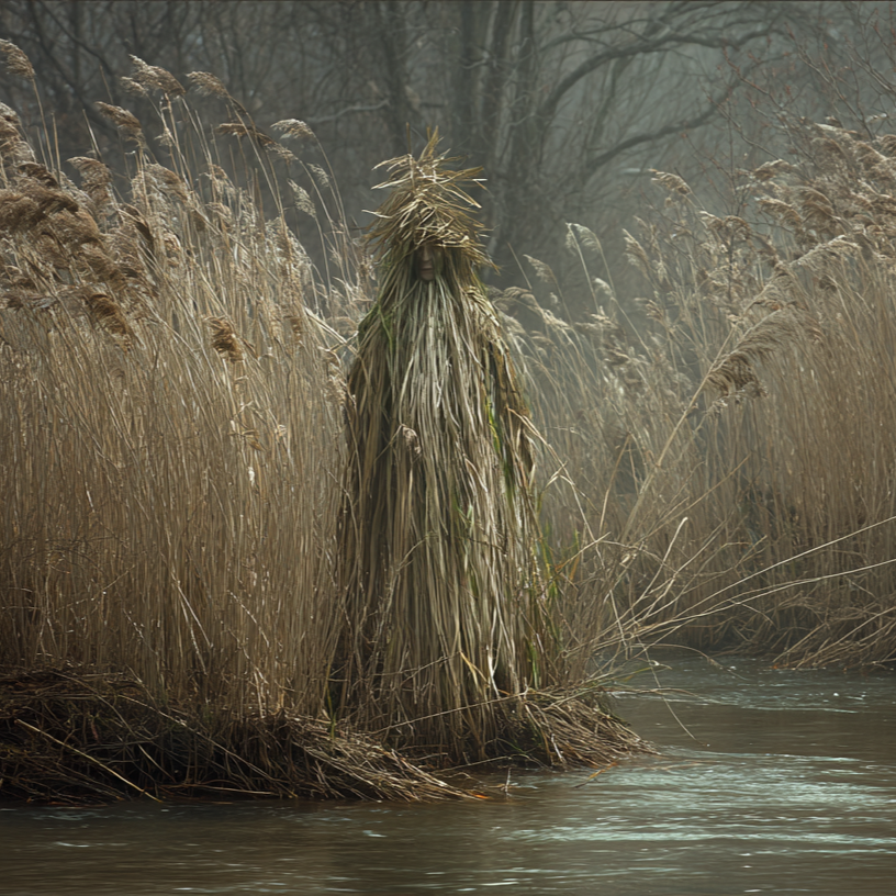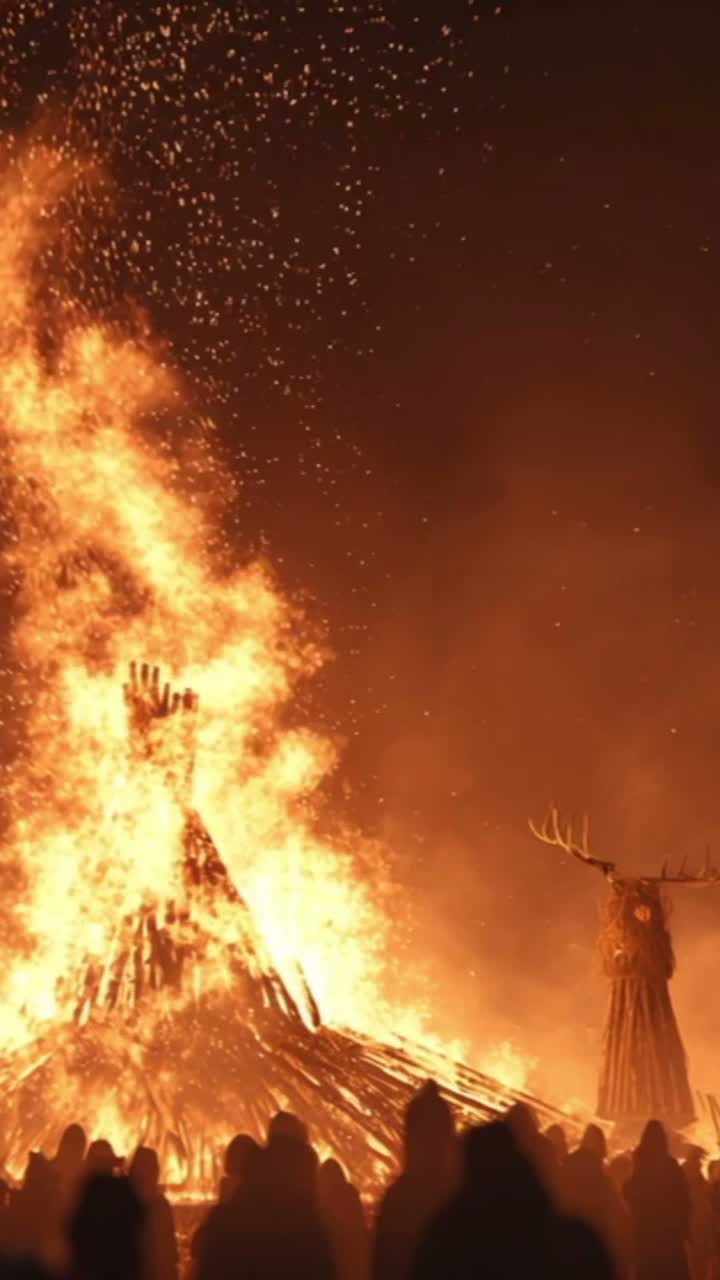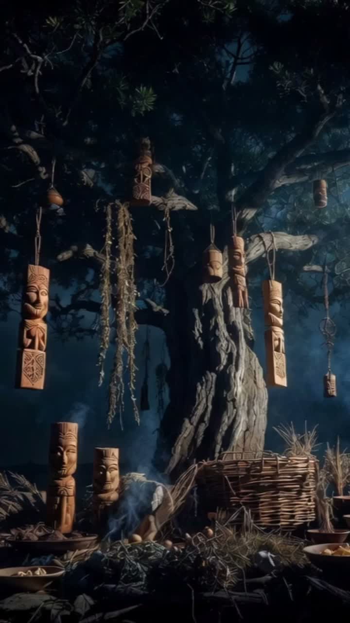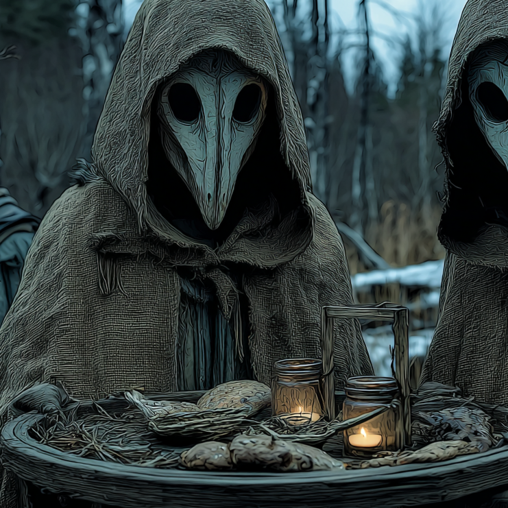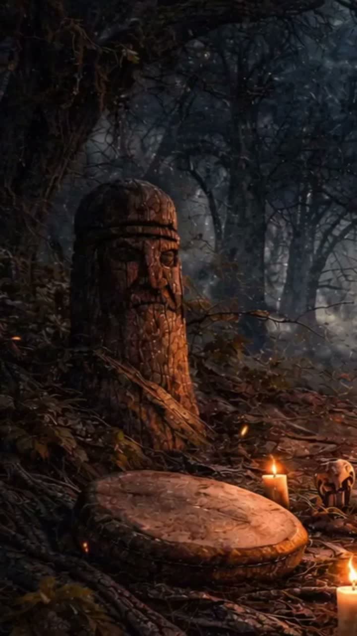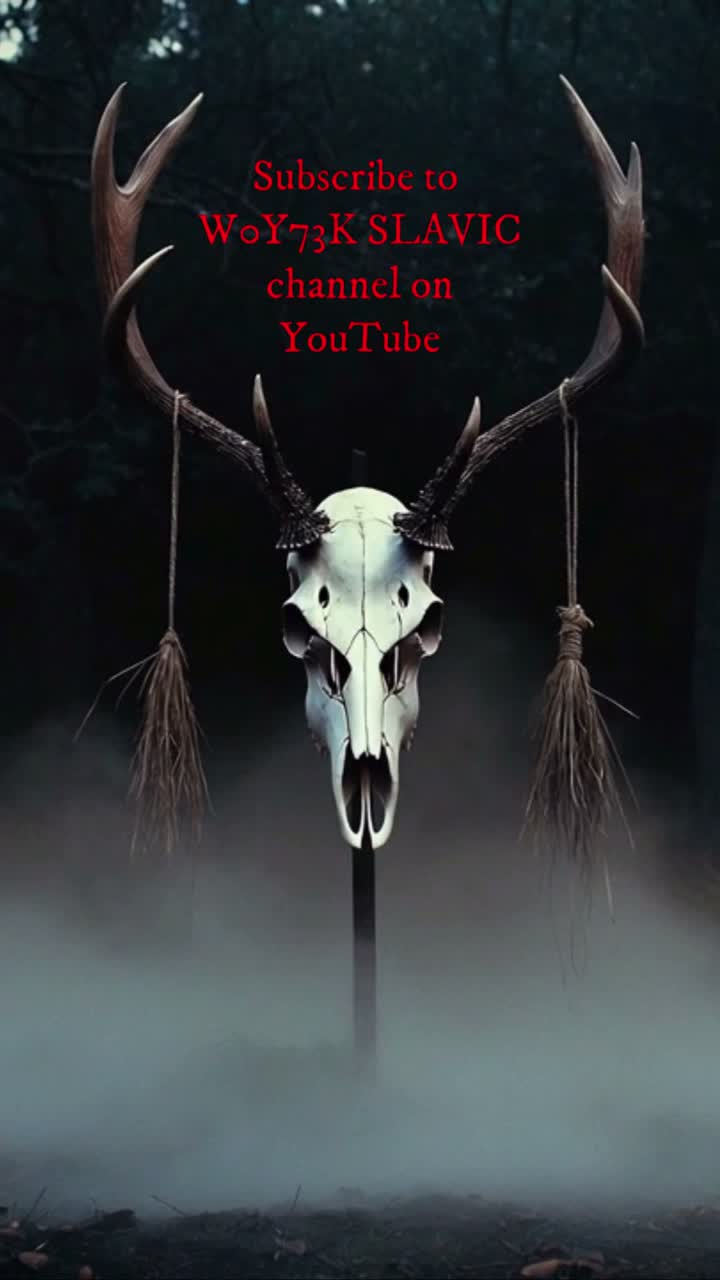 A dark ritual ambient piece inspired by Slavic pagan atmosphere, lasting around 3, 5 minutes, Low droning textures and minor tonal clusters form a static, oppressive base, Breath-driven wooden folk flute phrases appear sparsely like ceremonial calls, Subtle ritual percussion and forest field recordings—wind, wood creaks—create a cold, archaic, and ominous mood with slow evolution and no melodic release