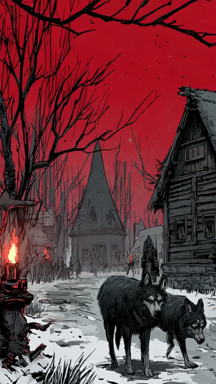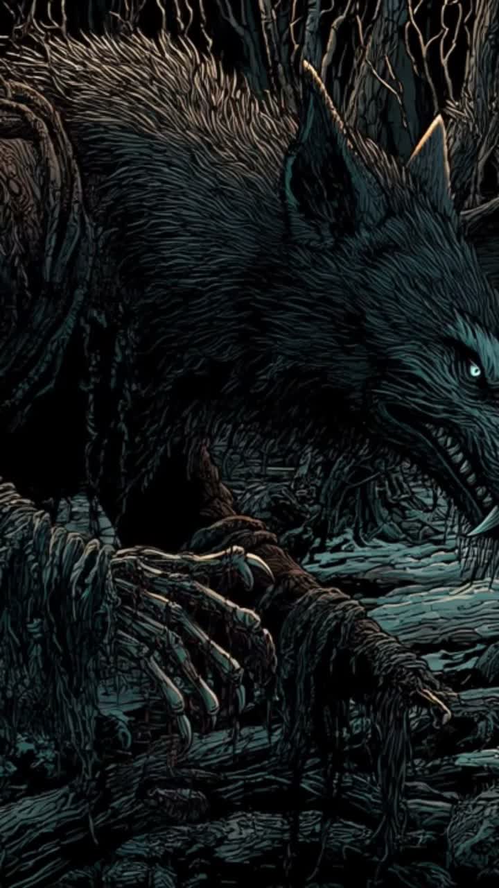 Dark Slavic ambient-trance werewolf hunt, ~10 minutes long, Drums start immediately and keep a steady mid-tempo pulse—no sudden tempo shifts, no hard section changes, Heavy frame drums, low toms, stomping tribal hits with subtle evolving patterns, Wolf howls, snarls, barking bursts, distant running paws, night forest ambience (wind, branches), Deep ominous drones, gritty low-end, Trans-inducing repetition with slow ambient evolution, Instrumental only—no vocals, no chanting, no lyrics, No flutes, no folk melody