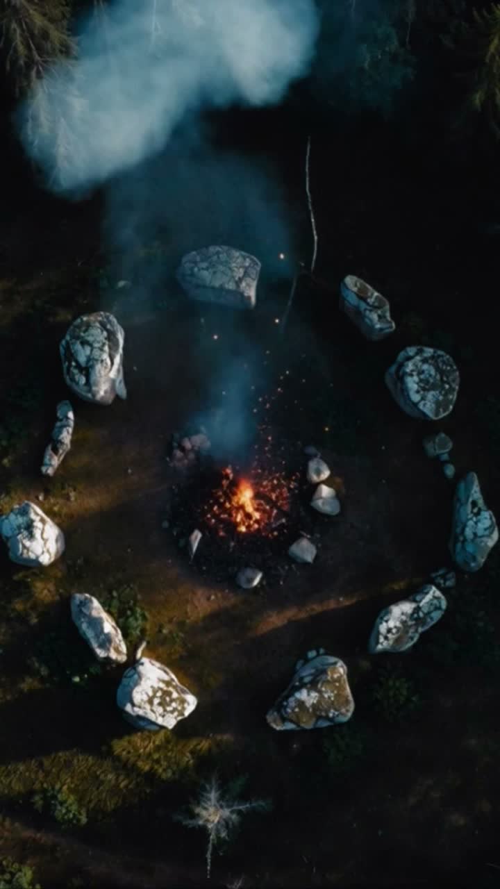 A gloomy Slavic ritual ambient track with heavy, hypnotic percussion (88–96 BPM): deep toms, low kick pulses, frame-drum thuds, iron clanks, and sparse bone-clicks, Cold drones and minor clusters hang over night-forest ambience (wind, creaking wood), No flutes, no lead melody, Add a druid-like male bass hum—wordless, throat-resonant—treated as texture, not singing