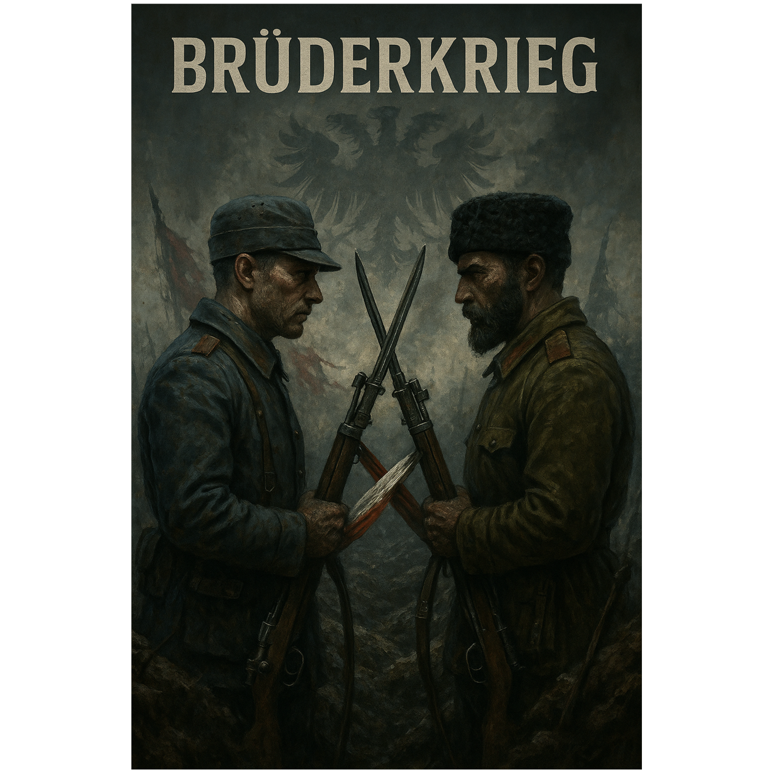 Language: Polish & German, Imperial funeral-march blackened doom metal with orchestral brass and field percussion core â dual-language vocal structure (Polish lament + German command recitation), distorted bass tuba and baritone guitar unison riffs, snare & timpani cadence in dirge tempo, low brass drone (trombones + contrabass tuba), parade bass drum & chain impacts, field trumpets echoing fragmented âGott erhalteâ motif intertwined with minor fragments of âJeszcze Polska nie zginÄĆaâ; male choir in layered chant alternating between âBrat na brataâ and âBruder gegen Bruderâ; tempo 88 BPM, 4/4 half-march pulse with slow 3-beat phrasing; tonal foundation E minor / D Phrygian Dominant; atmosphere of tragic unity and fraternal bloodshed â Poles fighting under opposing empires, brother against brother beneath the collapsing double eagle