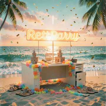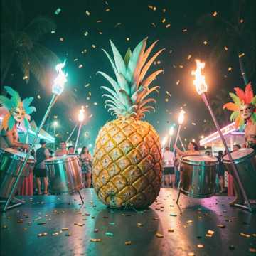 Upbeat Latin pop over four-on-the-floor bossa feel, slightly brisk tempo, Intro blends light Hawaiian guitar licks with cute, 8-bit-style future bass plucks, sidechained pads, Verses use playful double-male rap (one low, one higher) trading bars atop tight rimshot triplet patterns and bouncing bass, Pre-chorus opens melodically with female vocal lead and stacked harmonies, percussion gradually filling the stereo field, Chorus explodes into a beach-party chant with male/female unison, crowd call-and-response shouts, and bright brass stabs; energy stays high but breezy, Final hook repeats and ad-libs ride out over an extended groove