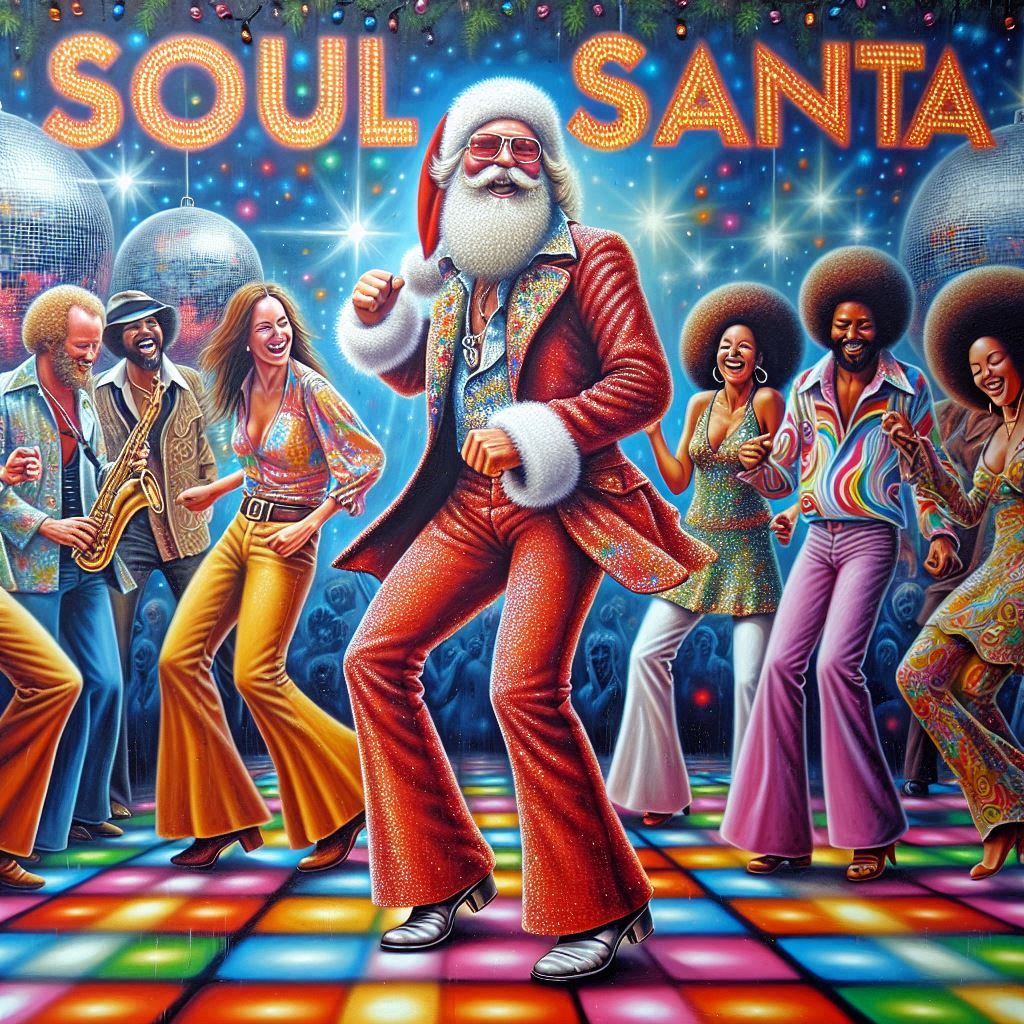 Christmas song, surf rock, swing, funk, doo-wop vocal group, 70's retro band sound, summer, guitar, drum and bass, medium tempo