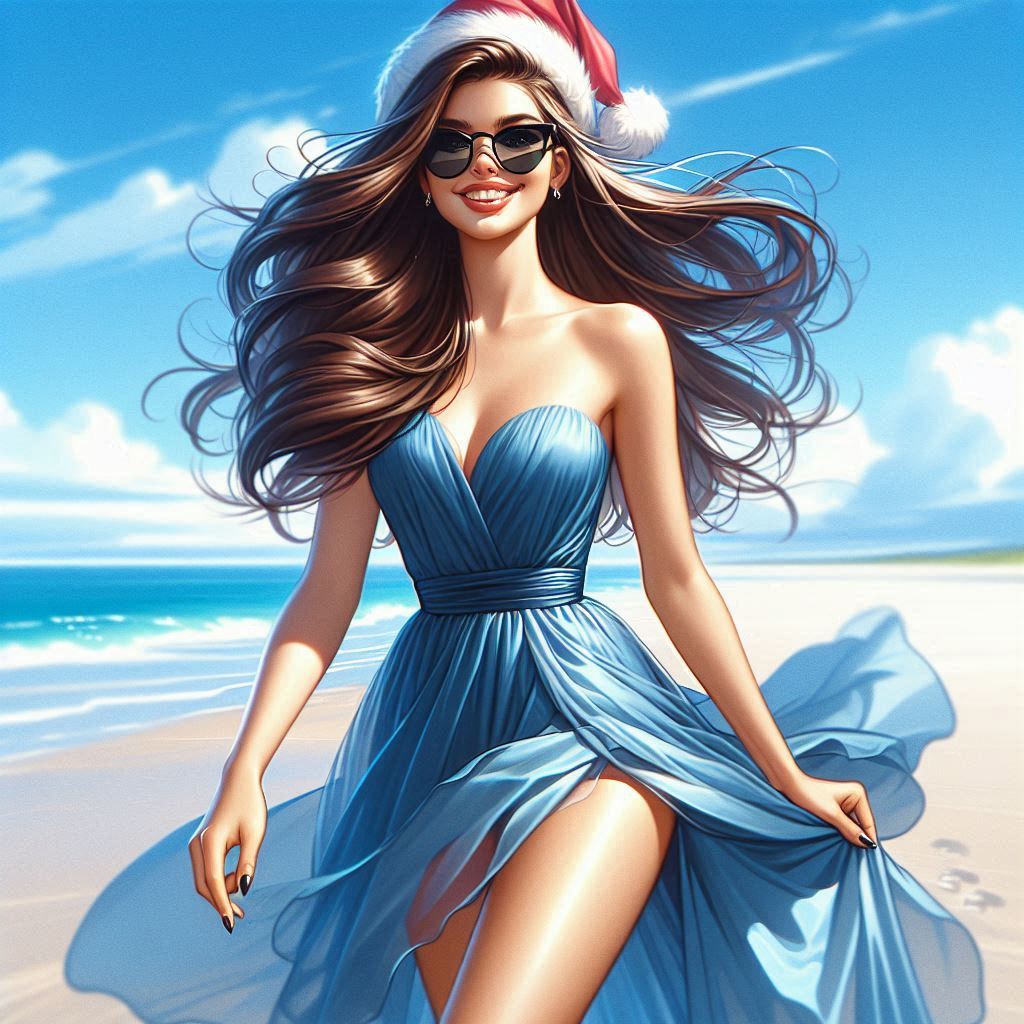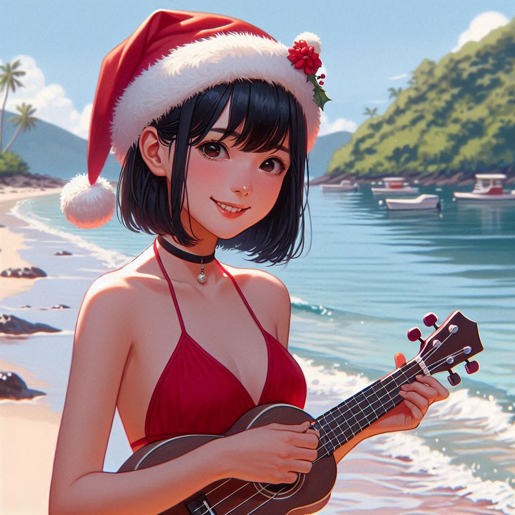 bright surf rock, upbeat pop rock, summer christmas, beach vibes, clean electric guitar, reverb guitar, catchy chorus, female vocal, cheerful, lighthearted, melodic, modern pop, mid-tempo, major key, warm tone, layered backing vocals, simple drum groove, bouncy rhythm, feel-good song