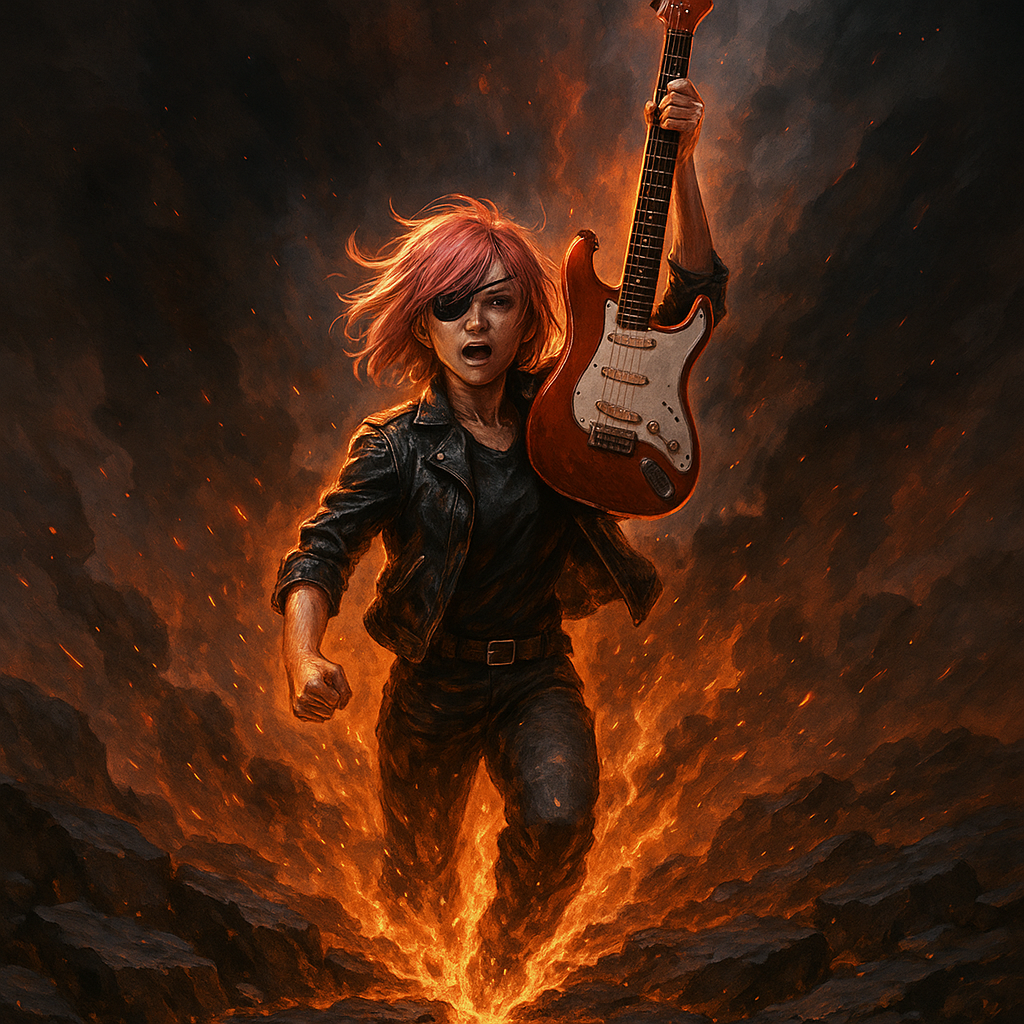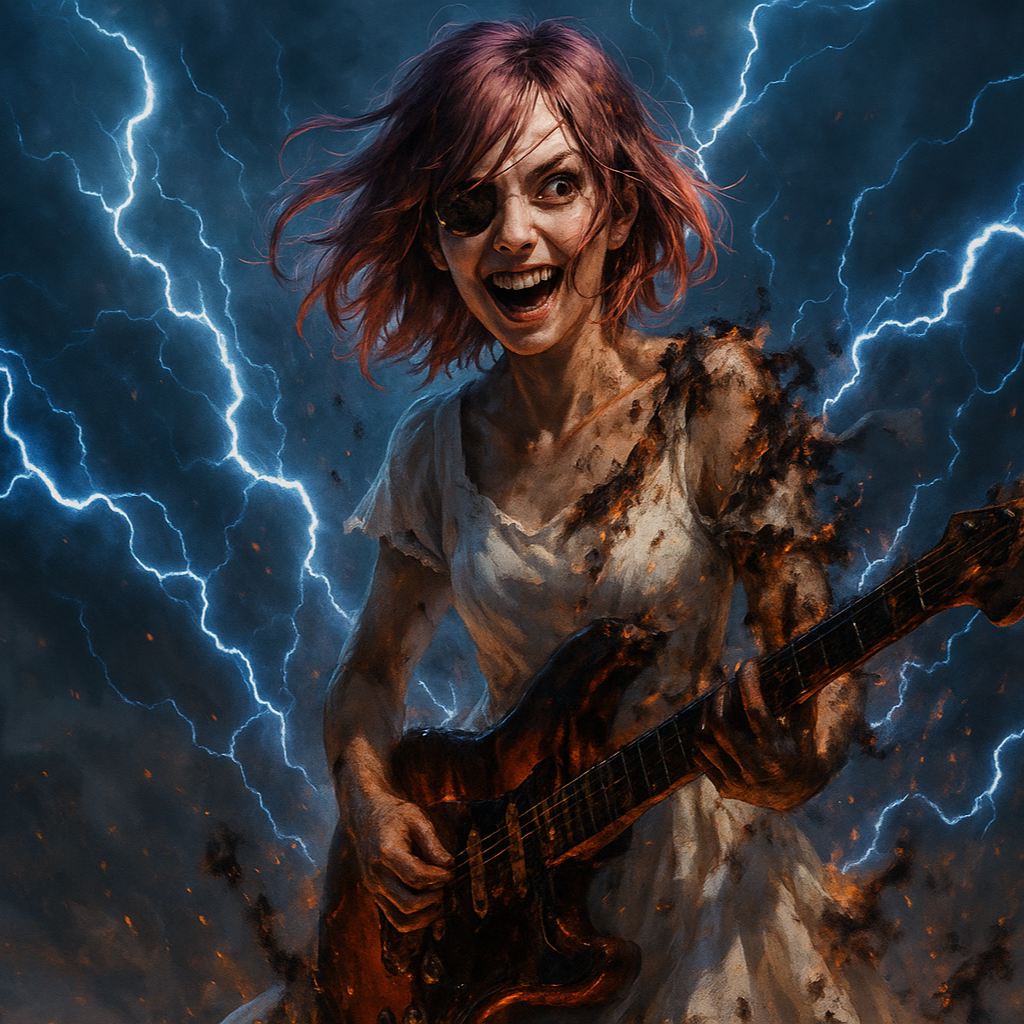 BPM 130, key F# minor, Explosive hardRock / alternative rock with industrial edge, Intro: 16-bar distorted guitar solo with thunder-like slides and screaming bends, Aggressive rhythm guitars, driving bass, powerful double-time drums, Female vocal: raw, defiant, commanding — alternates between shouted and melodic delivery, Verses: tense and rhythmic; Choruses: loud, anthemic, rebellious, Bridge: emotional with storm sound FX or low synths symbolizing rebirth by lightning, Final double chorus with layered screams and guitar feedback outro, Mood: fierce, triumphant, cathartic — the rebirth of a rebellious self