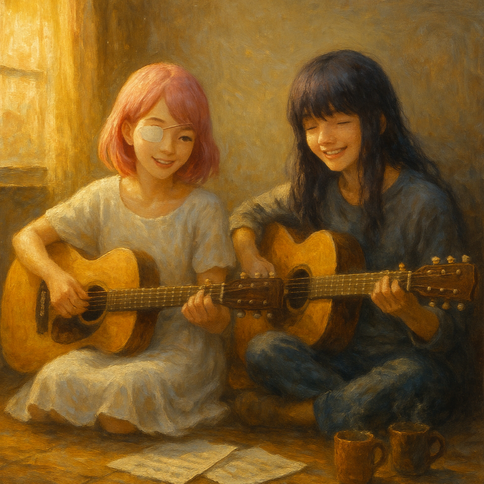 BPM 100, key G major, Simple and heartwarming folk song featuring acoustic guitar and soft drums, Warm, natural vocal tone — emotional but gentle, expressing quiet friendship and hope, Arrangement: minimalistic, with fingerpicked guitar, light percussion, and occasional harmony vocals, Mood: nostalgic, optimistic, peaceful — symbolizing sunrise, renewal, and eternal friendship, Song theme: accepting change, walking forward together, celebrating new beginnings