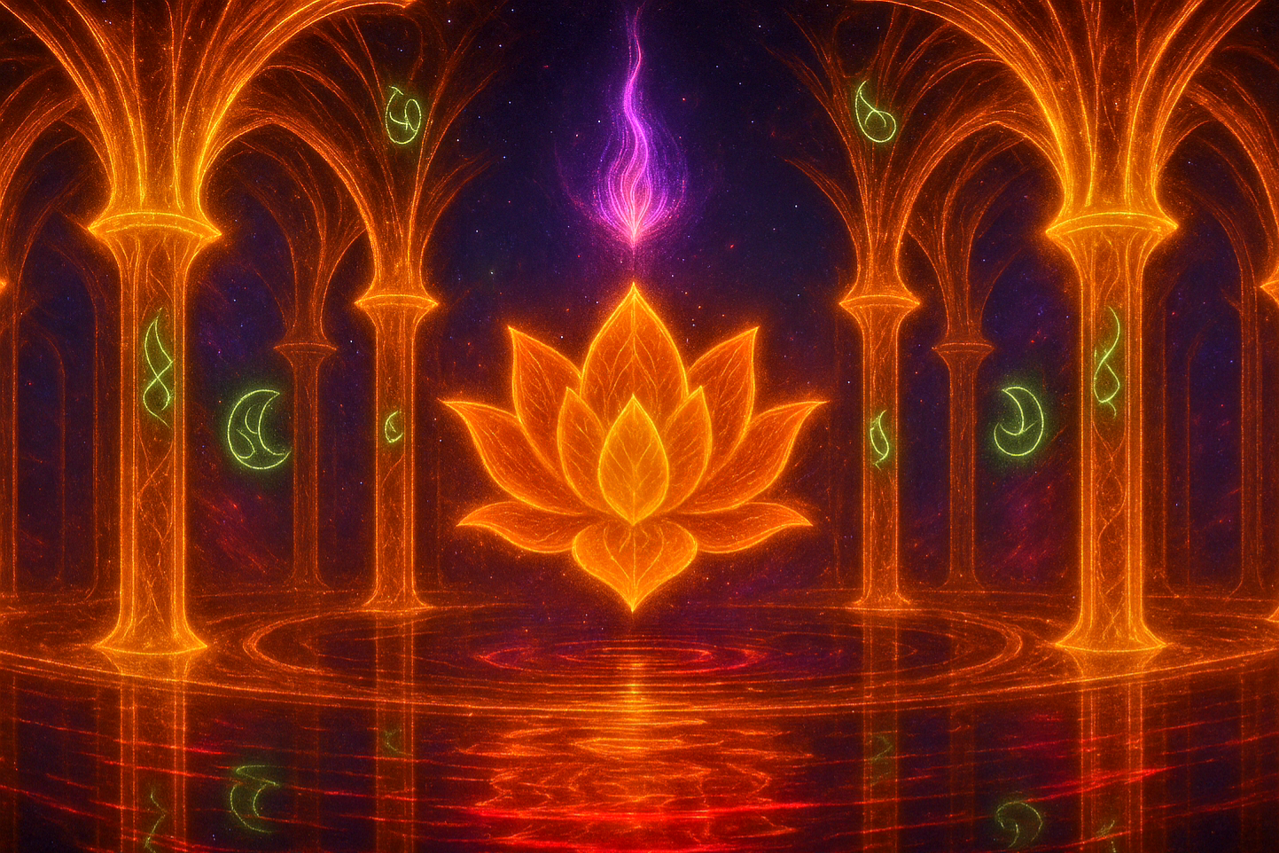 Temple-house ambient track 133 BPM, six parts deep melodic house four parts meditative stillness, Sub-bass warm pulse rising from sacral breath while golden pads shimmer like flowing water and inner fire, Vocal mantra soft rhythmic repeating Om Va Ra Ha Ka Ma Sha Soha Om from unity I breathe sacred waters fire refines desire creation whole protected pleasure and purpose one current energy returns radiant I honor the waters within ever-renewing fertile sovereign, Groove minimal hypnotic tribal percussion and frame-drum heartbeat, Drops bloom in luminous synth arcs symbolizing expansion, Melody suspended minor to radiant major lift with fluid arpeggios, Frequencies 396 Hz ground 528 Hz heart 963 Hz illumination, Vocals serene glowing trance-inducing, Each loop encodes safety creativity flow and joy, sonically transcendent