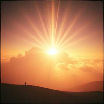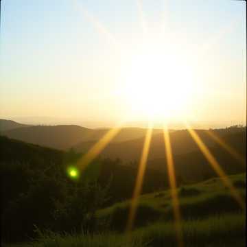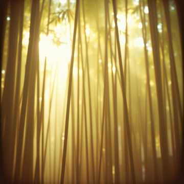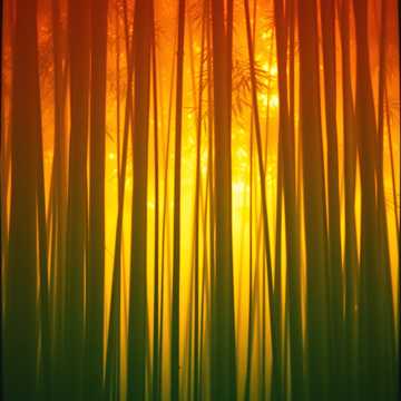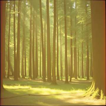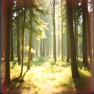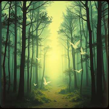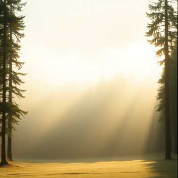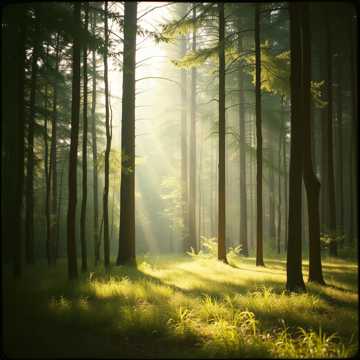 Atmosphere: sunrise in a living forest, radiant and sacred