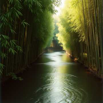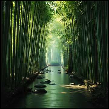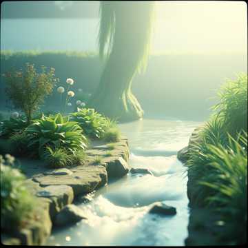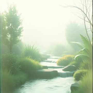 Cinematic nature-inspired ambient, Tempo 60 bpm, synchronized with forest breath, Atmosphere: earthy, watery, alive, Instruments: field recordings of water and leaves, harp plucks like raindrops, wooden percussion, shakuhachi flute, subtle string drones, Vocals: light airy voices (ahh) blending with wind, Dynamics: silence → rustling leaves and flute → choir and harp merging with water → fade into stillness, Feeling: belonging, rootedness, harmony with earth