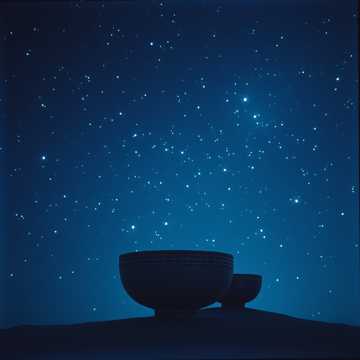 Sacred cinematic ambient with Tibetan bowls, drones, distant harp, soft wind textures, wordless choir (ahh, ooh), Tempo 48 bpm, Atmosphere: dreamlike, timeless, starry sky, Dynamics: silence → bowls and drones → choir like stars emerging → fade into infinite quiet, Style: deep rest, night meditation, onsen under stars