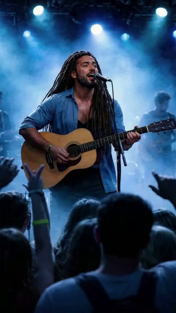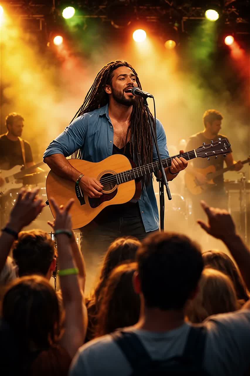 reggae reggaeton, guitar acoustic fingerstyle, high energic powerful performance vocals, synthé atmosphérique, live concert