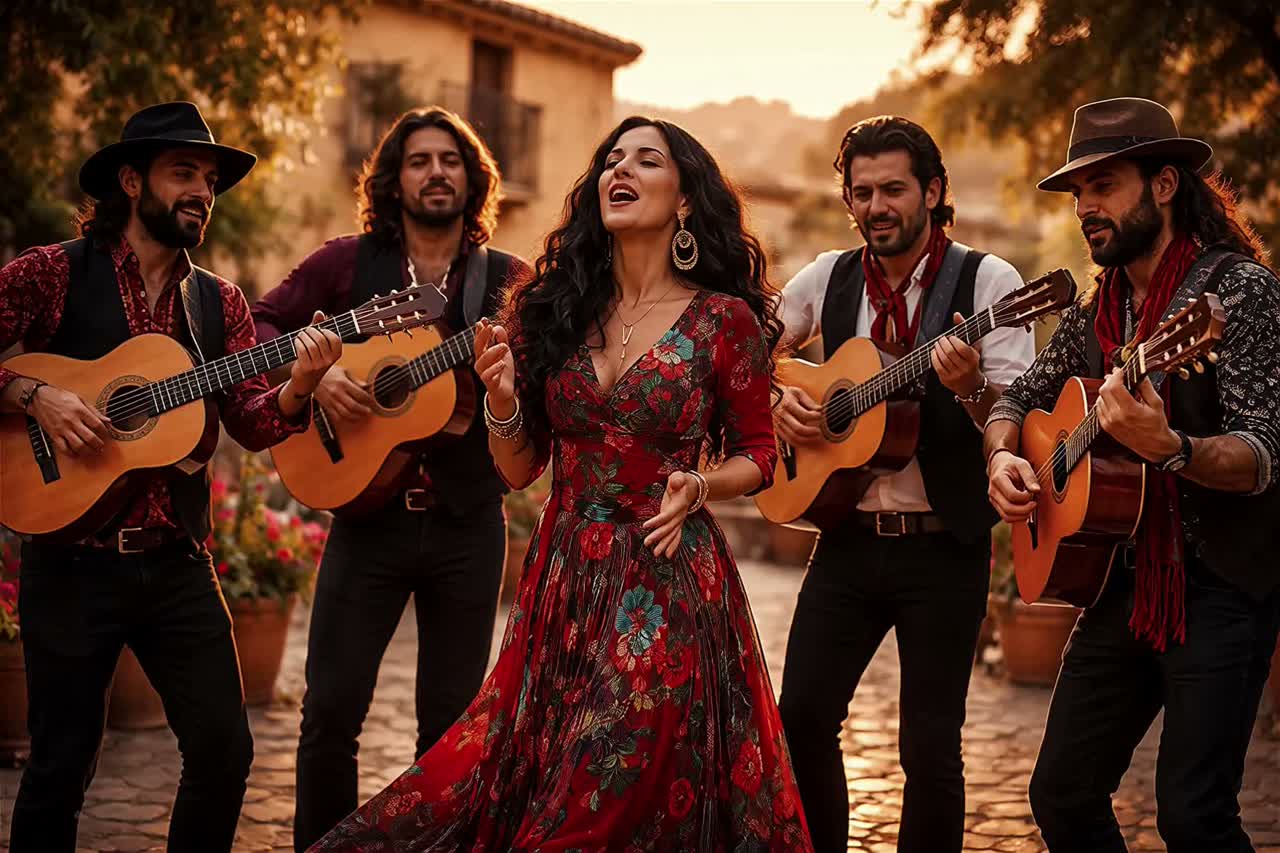 Flamenco gitano, Guitar acoustic, The structure follows an A-B-A form, with a central section that introduces slightly more complex rhythmic patterns before returning to the primary theme, High High energy powerful vocals, Strong strength vocals, Espagnol, Guitar flamenco, Clap hand