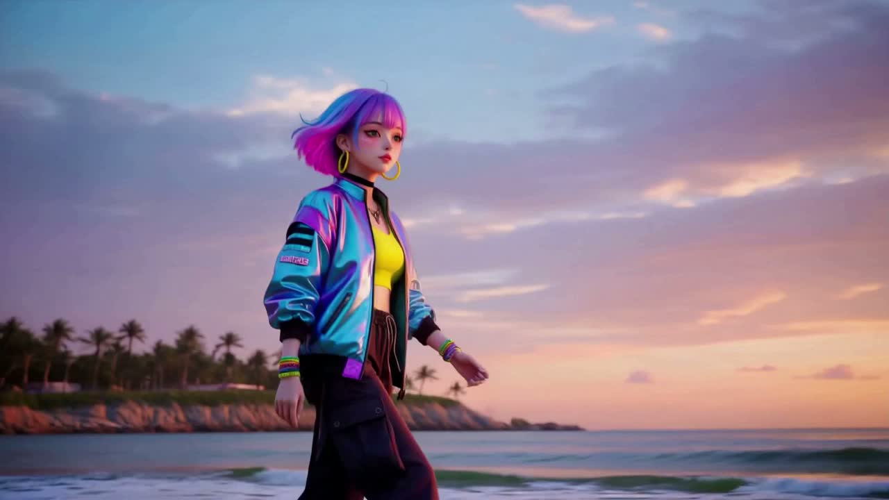 A lush mix of 90s R&B chords and futurefunk textures sets a dreamy foundation, Sweet, soft, and uniquely styled female vocals float over syncopated future funk bass and glittering kawaii synth riffs, Lively kawaii future bass beats, sparkling synth FX, and funky rhythmic breaks keep it groovy