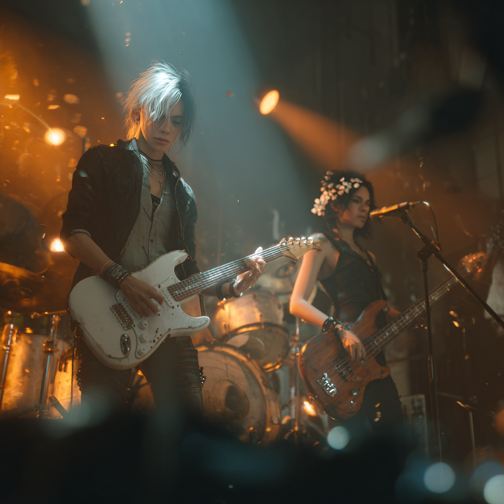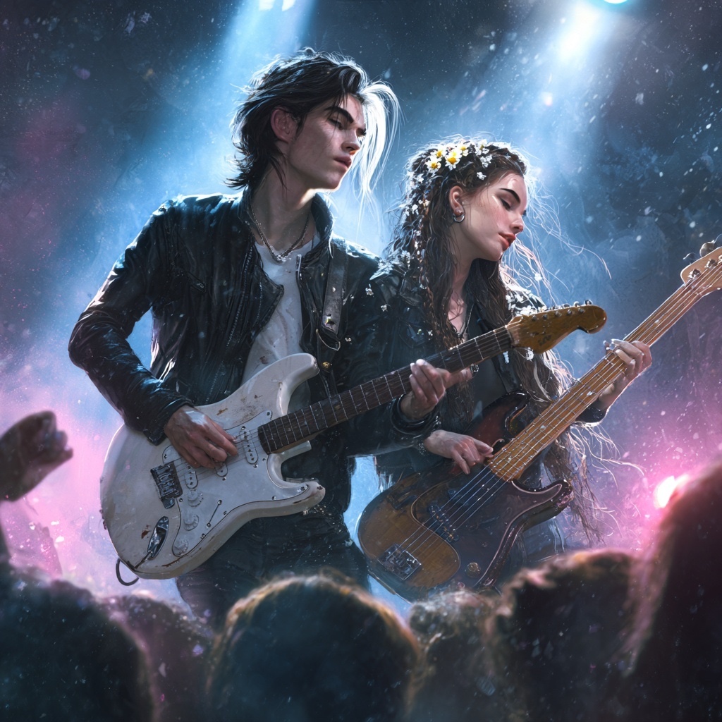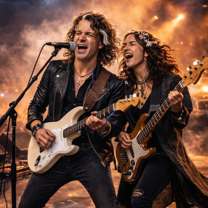 High-energy modern power pop duet with bright, driving electric guitars and melodic hooks, Upbeat 4/4 tempo around 155–165 BPM, Crunchy rhythm guitars in verses, wide open shimmering chords in chorus, Punchy live drums with tight snare and energetic fills, Bouncy melodic bassline supporting the groove, Romeo lead vocal confident, warm grit, slightly edgy tone, Chorus lead vocal clear, expressive, strong melodic presence, Verses alternate between Romeo and Chorus, Big stacked harmonies in the chorus with both voices blended tightly, Call-and-response moments between leads, Explosive, singalong chorus, Clean, radio-ready production, Bright, celebratory, intelligent, communal energy, Mood: confident, melodic, uplifting, heart-on-sleeve