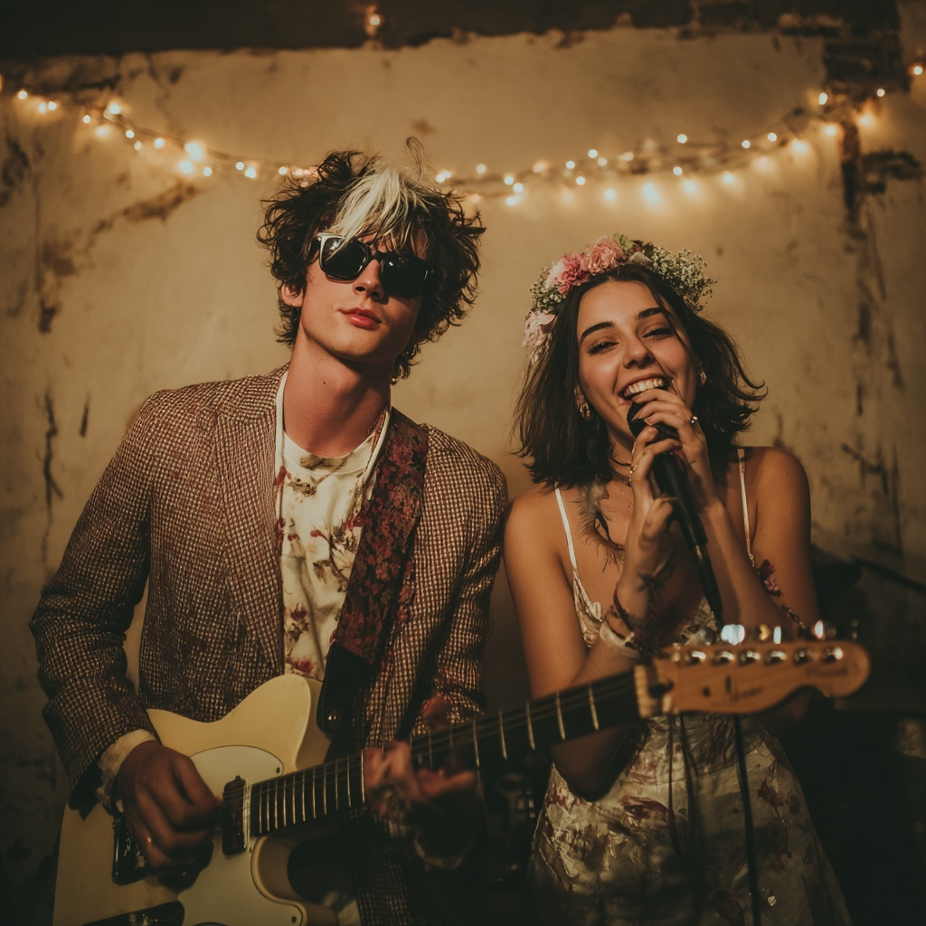 • Romeo — confident, melodic male lead, slightly gritty, forward-moving, • Chorus — clear, energetic female vocal, sharing lead lines and lifting hooks, Call-and-response verses, stacked harmonies in the chorus, Big, joyful, sing-along hooks with tight phrasing and sharp starts, Tempo: fast-mid, upbeat and propulsive, Production: clean, punchy, modern with a timeless band feel, Mood: hopeful, romantic, resilient, alive, Finish strong or with a quick fade — no long outro