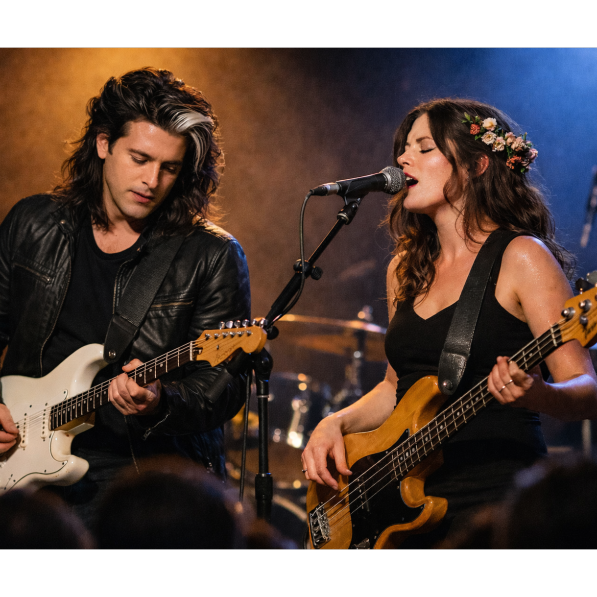 Melodic power pop built around constant vocal harmonies, Mid-tempo ~105–120 BPM, uplifting and confident, Bright, jangly electric guitars with clean tones and light crunch, Warm, melodic bass that supports harmony and groove, Tight, steady drums — energetic but never aggressive, Male and female duet vocals throughout, Voices blend constantly: call-and-response verses, unified choruses, layered harmonies on key lines, Harmonies are the emotional core — rich, close, and reassuring, Lead vocals are sincere and conversational, not showy, Songwriting is simple, clear, and timeless, Production is warm and organic — no gimmicks, no excess effects, Mood: hopeful, human, joyful, and grounded, Feels like classic power pop reborn — a song you can sing with someone else the first time you hear it