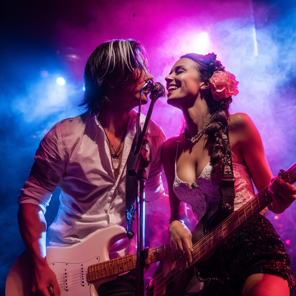 Upbeat, fast-tempo modern pop duet, Bright, driving drums with tight pop groove, punchy kick and claps, Clean electric guitar riffs with rhythmic chug, warm bassline that dances, Sparkling synth accents for lift and momentum, Male and female lead vocals trading lines playfully, strong chemistry, joyful energy, Big, catchy chorus with stacked harmonies, Clean, modern production, radio-friendly, feel-good, confident, fun, Celebration of music, connection, and the moment when everything lifts together