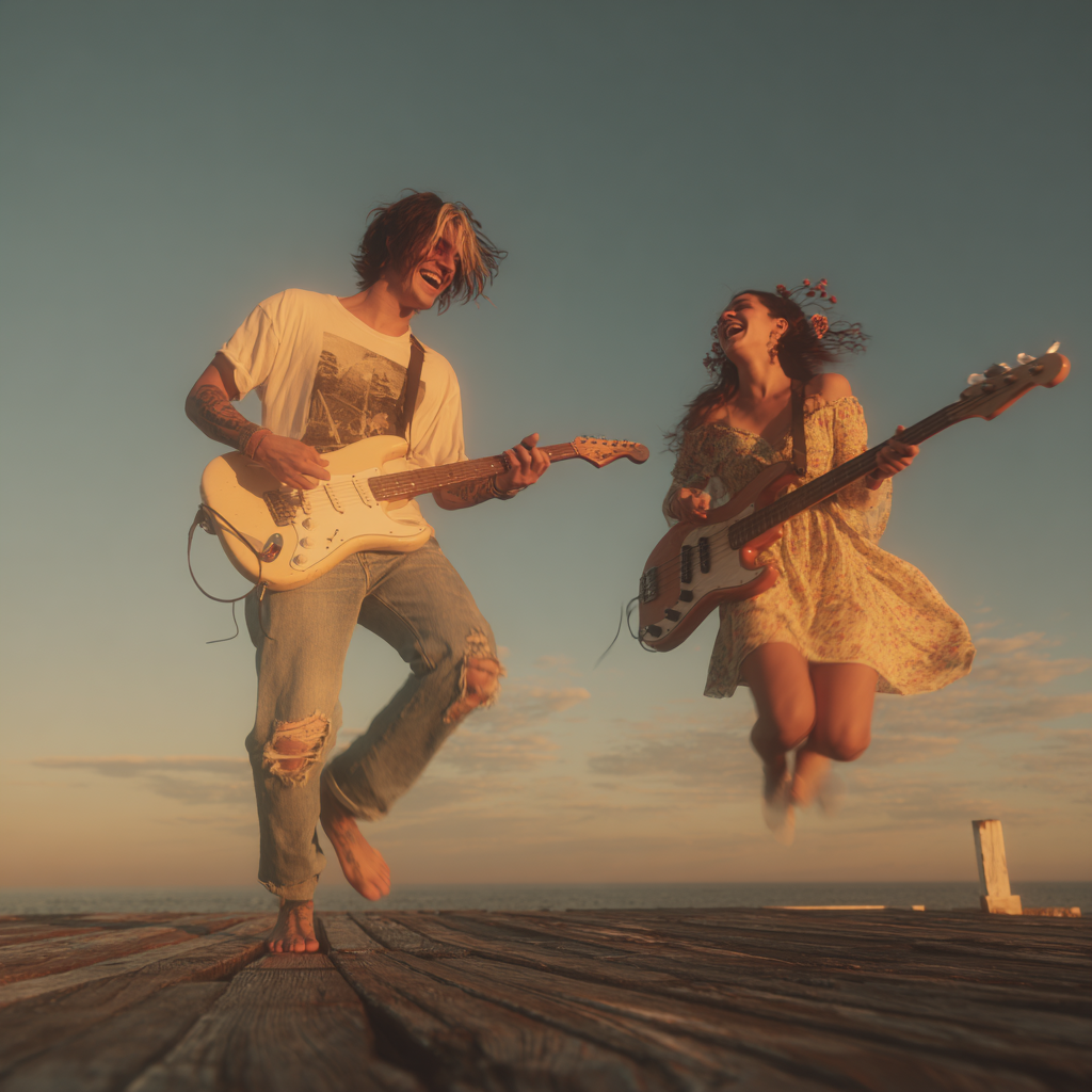 Bright, driving power pop duet, 148 BPM, Crunchy rhythm guitars with chiming 12-string layer, punchy bass, energetic live drums with big snare on 2 & 4, Upbeat, hook-heavy, radio-ready, Male/female duet vocals trading verses, stacked harmonies in chorus, gang “oh-oh” backing vocals, Clean but warm production, no distortion overload, Big melodic lift in chorus, soaring harmonies, tight stop-start accents before final hook, Slight 90s alt-pop edge (Weezer/Fountains of Wayne vibe) but joyful, not ironic, Polished, bright, major key, optimistic energy, Catchy, anthemic, human, playful, No synth dominance — guitar-forward