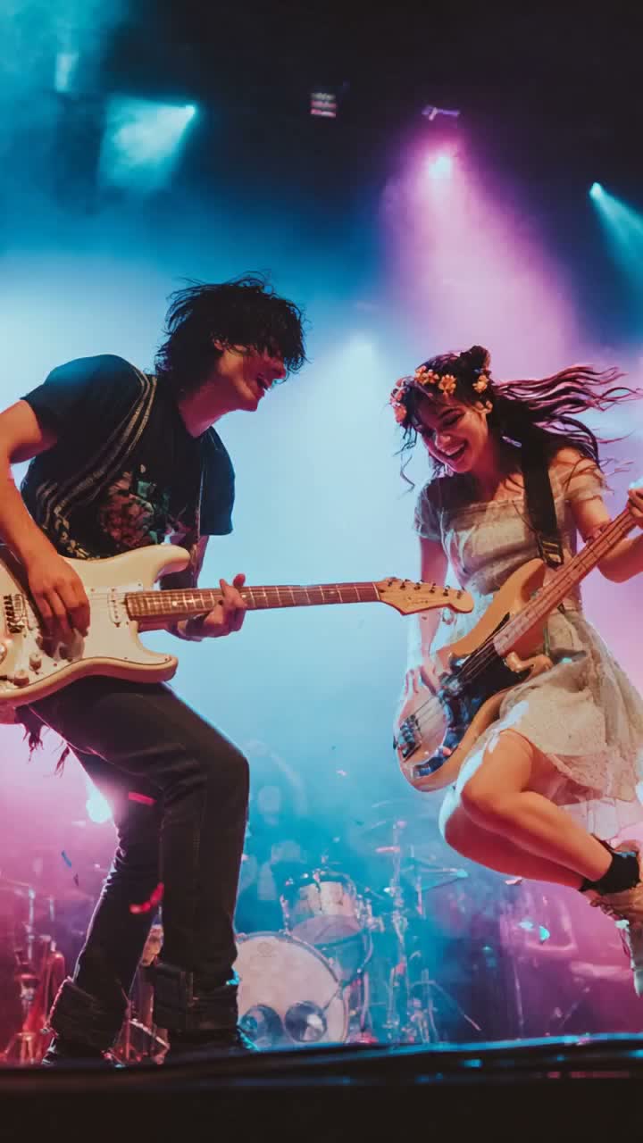 Upbeat power pop duet with crunchy 90s alternative guitar tone, Weezer-style distortion and tight palm-muted verses exploding into big open-chord choruses, Male and female vocal trade-offs and harmonized chorus shouts, Energetic, slightly nerdy confidence, Clean but punchy mix, Tempo around 150–165 BPM, Driving drums with snappy snare, steady kick, bright crash cymbals, Prominent melodic bass line locked with guitars, Verses: tight muted guitar riff with vocal back-and-forth, Pre-chorus: build with rising chords and stacked harmonies, Chorus: huge power chords, gang-style “POP! STOP!” call-and-response energy, Mood: fun, defiant, sugar-rush optimism, No synth dominance — guitar-driven, Radio-ready, hook-heavy, energetic but not messy