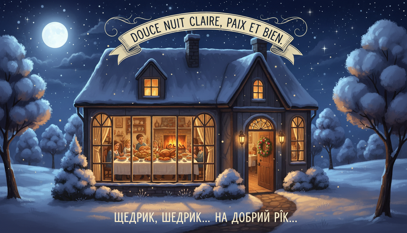 A mid-slow traditional Christmas folk carol unfolds with flowing, circular rhythm—acoustic guitar and gentle folk percussion give a light pulse, Rich piano, harp, and full strings blend with layers of bells, chimes, and glockenspiel for brilliant texture, Children’s French choir offers clear, innocent harmonies, supported by warm choir pads and lush natural reverb in a grand church-like space, creating a luminous and heartwarming festive sound