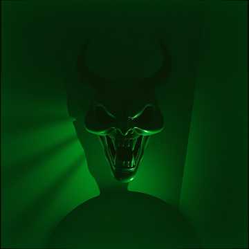 Create a looping ambient track for a dungeon chamber dominated by a large demon face sculpture and flickering green mirror light, Use low, pulsing drones and distant rumbling textures, like stone shifting deep underground, Add echoing metallic groans or dragging chains at irregular intervals, Include occasional breath-like gusts or deep, resonant exhalations to suggest something watching, Add sparse, sharp scraping or bone-click sounds to evoke the teeth of the demon maw, Use quiet, reverberated insect-like chittering or ritual drums filtered into ambient texture, Include distant, high-pitched harmonic tones or low chanting hums to suggest a trapped lever or cursed mechanism, Avoid melody or rhythm, No vocals or percussion, The mood should feel tense, expectant, and dangerous—like touching the wrong thing might awaken something, Target loop length: 3–4 minutes, seamless