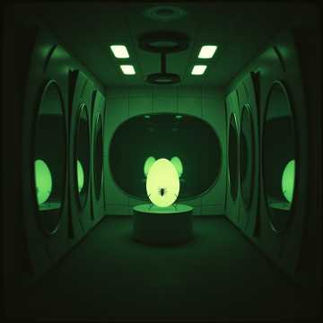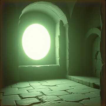 Create a quiet, looping ambient track for a large stone chamber lit by green light from a massive mirror, Use soft, low drones from organ or synth pads with long reverb tails, Include the gentle ringing of a single metal bell every 30–60 seconds—dry, distant, and echoing, Add faint, ambient wind or breath-like textures to suggest the room is heavy with silence and tension, Layer in subtle harmonic overtones or glassy tones that shift slowly, like a mirage, Do not use rhythm, melody, or percussion, Avoid drama or suspense—focus on calm stillness with an eerie undertone, The track should feel like standing in front of something ancient and unstable, just before crossing into another world, No vocals or musical flourishes, Emphasize quiet atmosphere, with distant echoes and decaying resonance, Target loop length: 4–5 minutes, seamless